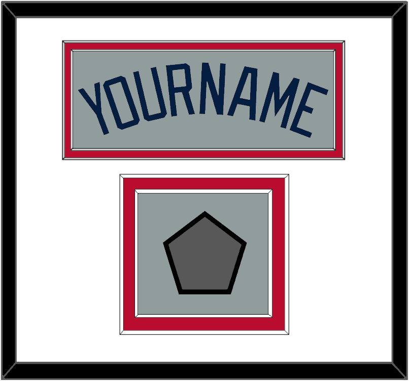 Atlanta Road Gray Jersey Name With 2021 World Series Champions Patch.  Double Mat Cut:   White Mat Over A Red Mat.  Blue Name & Patch Mounted On A Gray Mat.  Black Frame.