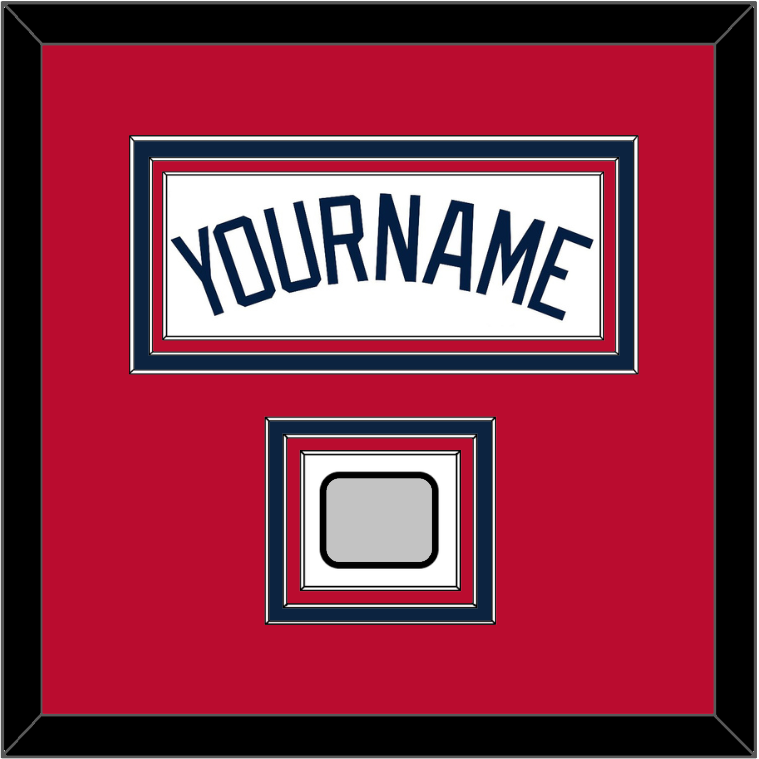 Atlanta Home White Jersey Name With 2021 World Series Jersey Patch. Triple Mat Cut: Red Mat Over A Blue Mat Over A Red Mat. Blue Name & Patch Mounted On A White Mat. White Or Black Frame.