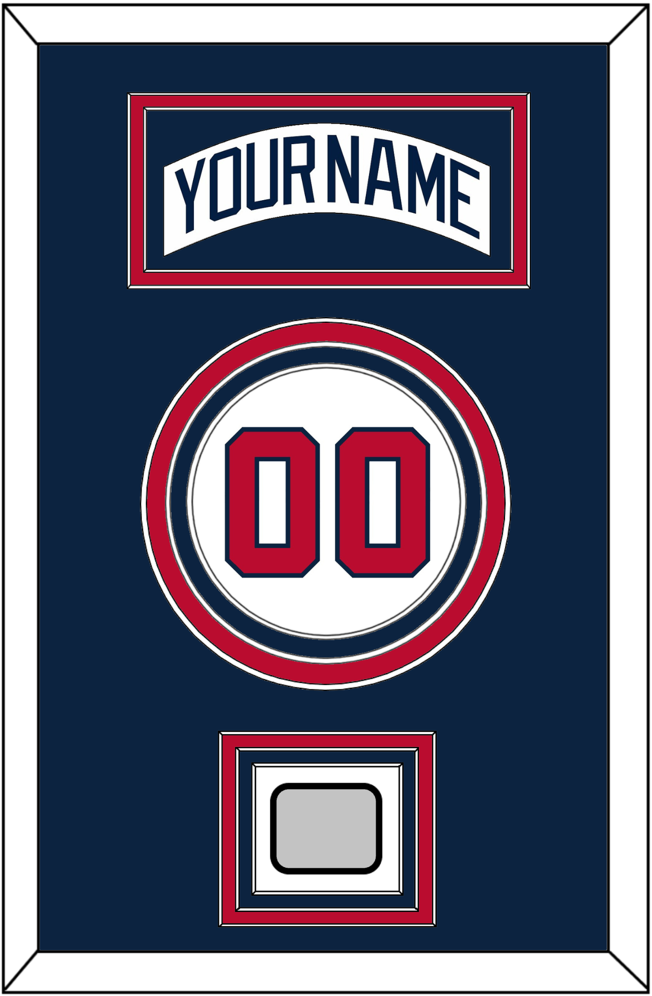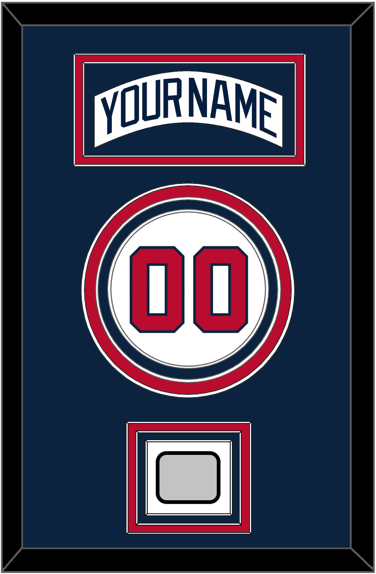 Atlanta Home White Jersey (1987 Through 2004) Nameplate & Number With 1995 World Series Jersey Patch. Nameplate Is Double Mat Cut: Blue Mat Over A Red Mat. White Nameplate Mounted On A Blue Mat. To Match The Jersey, Number And Patch Are Triple Mat Cut: Blue Mat Over A Red Mat Over A Blue Mat. Red Number & World Series Patch Mounted On A White Mat. White Or Black Frame.