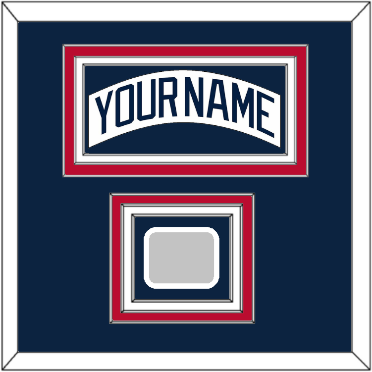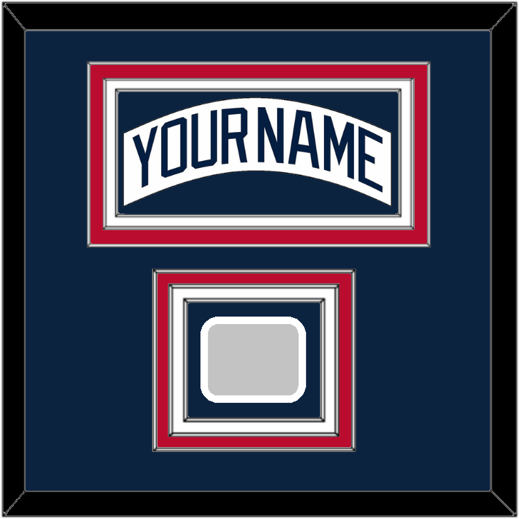 Atlanta Home White Jersey (1987 Through 2004) Nameplate With 1995 World Series Jersey Patch. Triple Mat Cut: Blue Mat Over A Red Mat Over A White Mat. White Nameplate & Patch Mounted On A Blue Mat. White Or Black Frame.