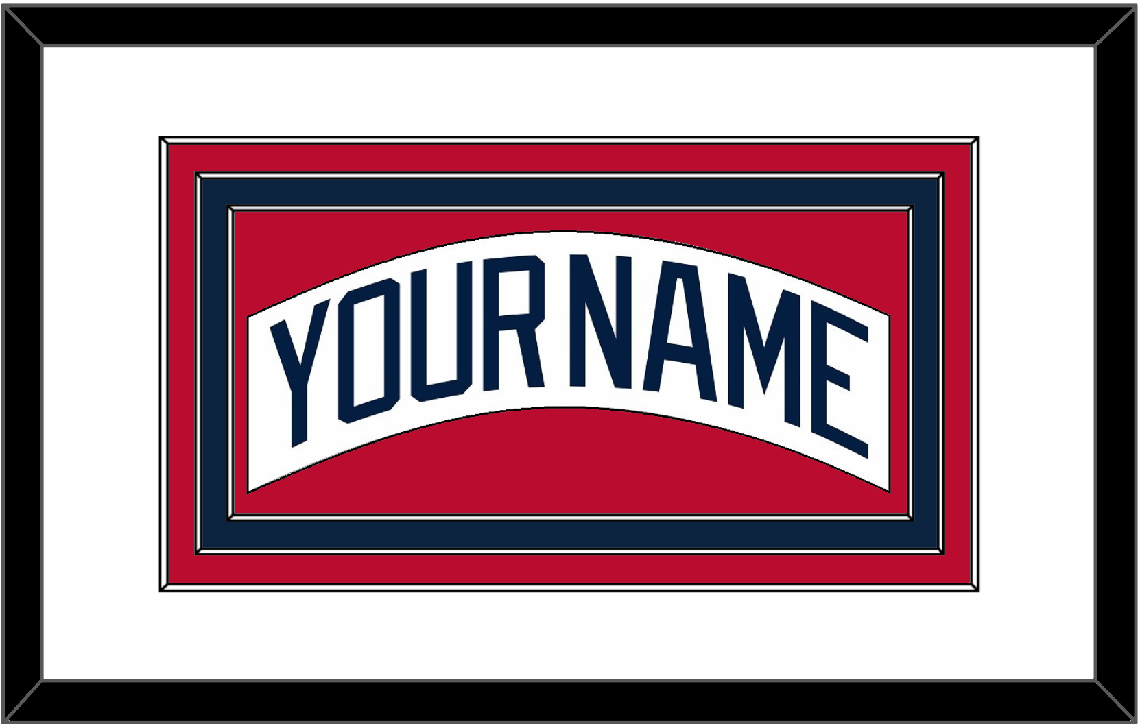 Atlanta Home White Jersey Nameplate (1987 Through 2004). Triple Mat: White Mat Over A Red Mat Over A Blue Mat. White Nameplate Mounted On Red Mat. Black Frame.
