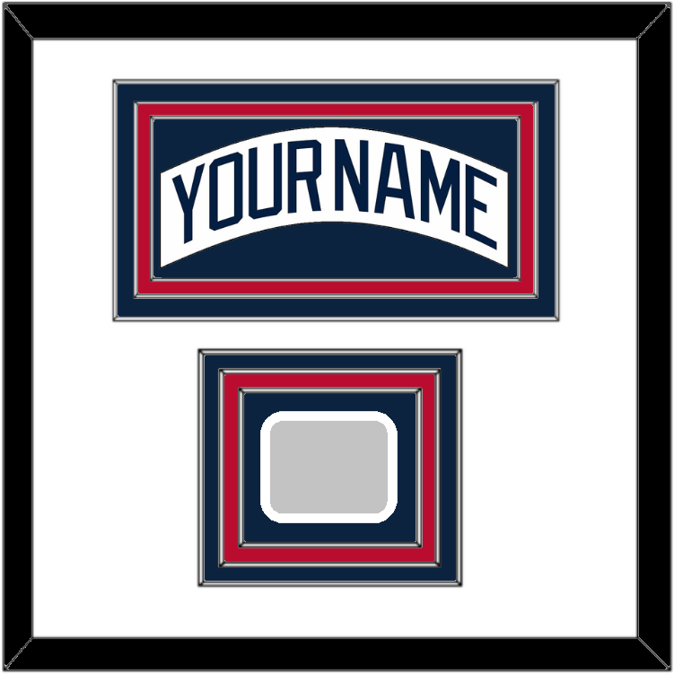 Atlanta Home White Jersey (1987 Through 2004) Nameplate With 1995 World Series Jersey Patch. Triple Mat Cut: White Mat Over A Blue Mat Over A Red Mat. White Nameplate & Patch Mounted On A Blue Mat. Black Frame.