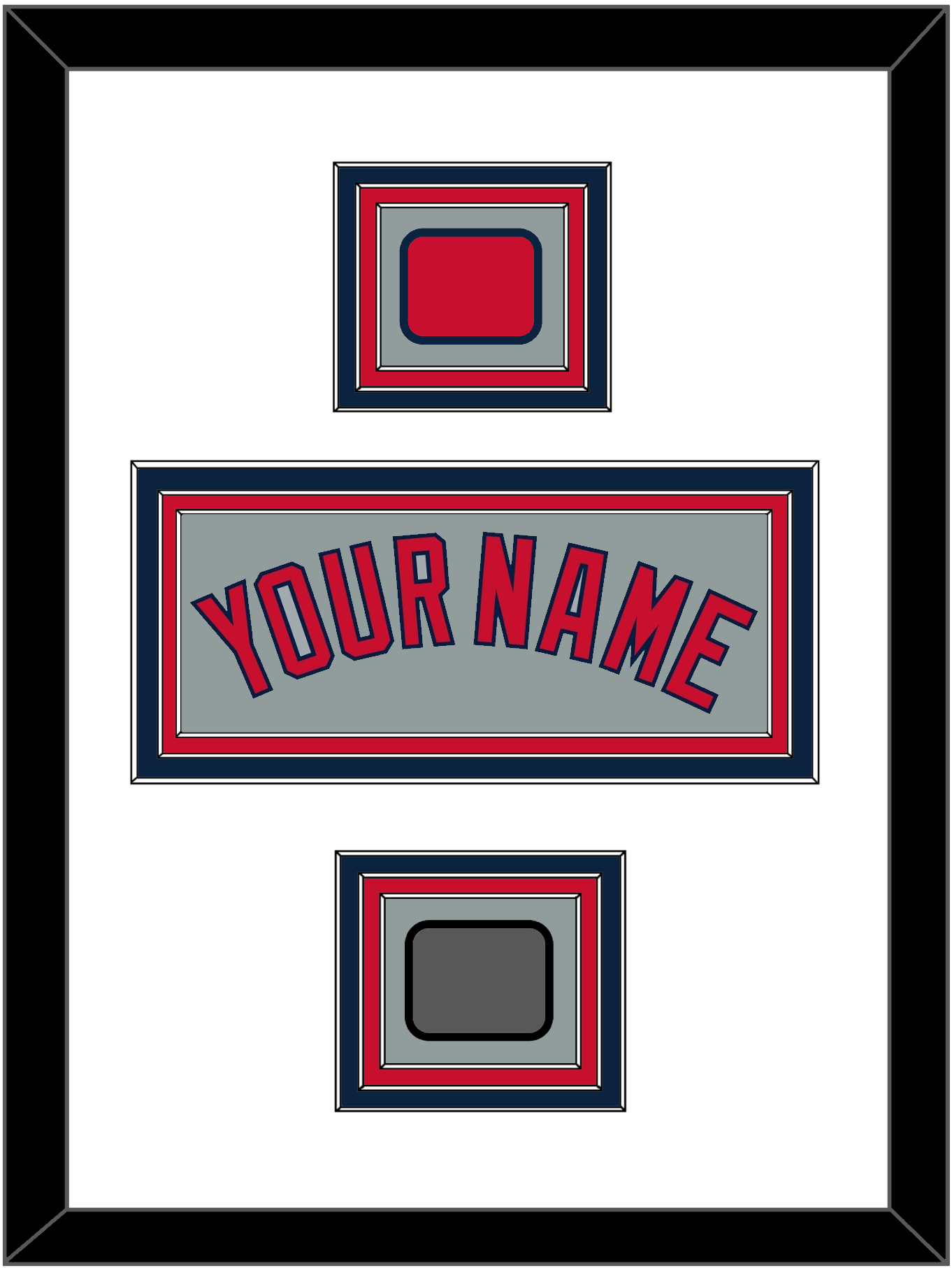 Boston Road Gray Jersey Name, Logo Patch From Sleeve And World Series Jersey Patch (2004, 2007, 2013 Or 2018).  Triple Mat Cut:  White Mat Over A Red Mat Over A Blue Mat.  Red Name, Number & Patches Mounted On A Gray Mat.  Black Frame.