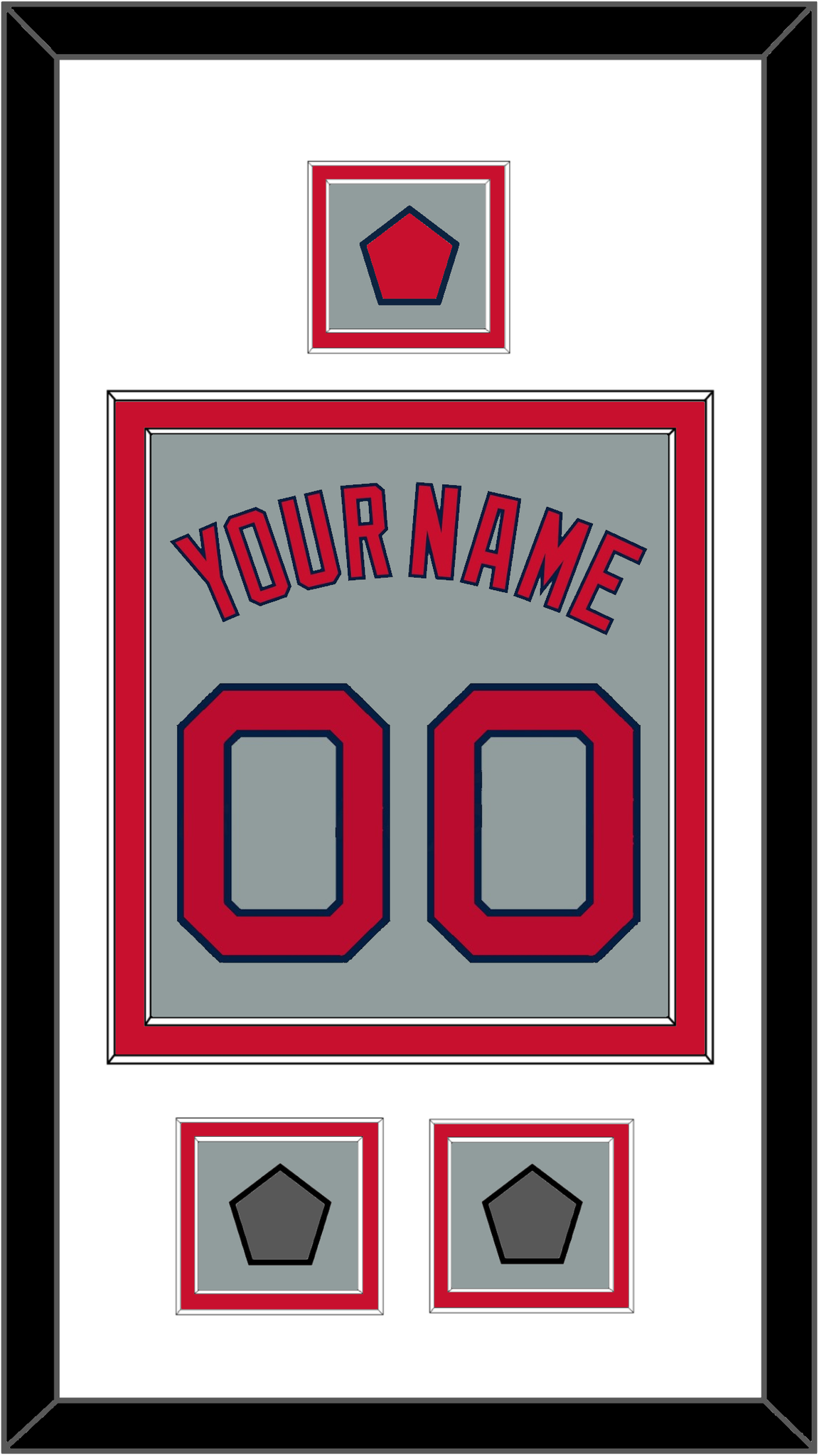 Boston Road Gray Jersey Name, Number, Logo Patch From Sleeve And Two World Series Champions Patches (2004 & 2007, 2007 & 2013 Or 2013 & 2018). Double Mat Cut: White Mat Over A Red Mat. Red Name, Number & Patches Mounted On A Gray Mat. Black Frame.