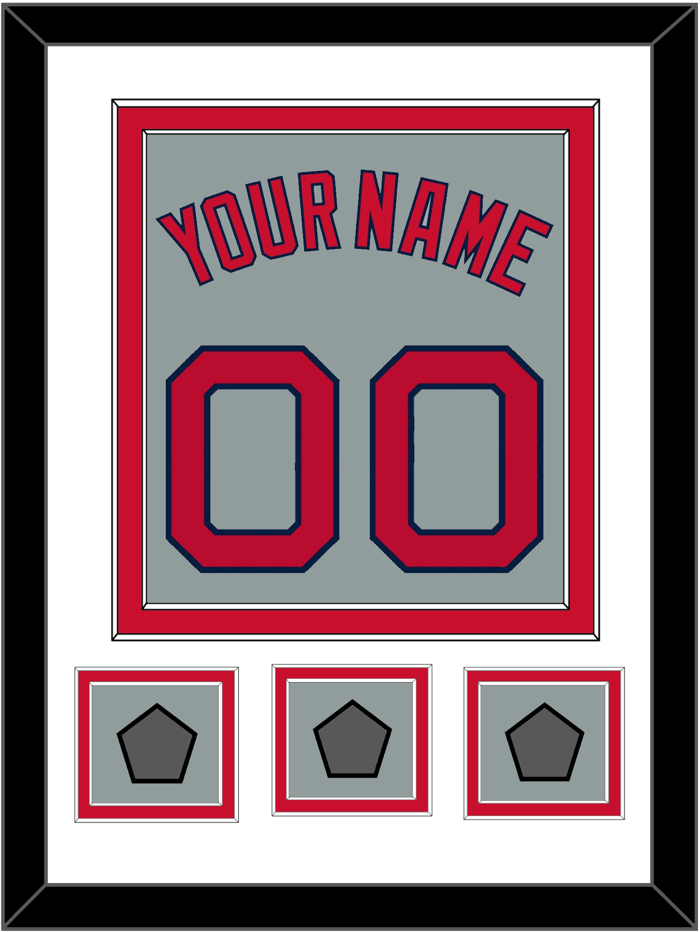 Boston Road Gray Jersey Name & Number With 3 (2004, 2007 & 2013 Or 2007, 2013 & 2018) World Series Champions Patches. Double Mat Cut: White Mat Over A Red Mat. Red Name, Number & Patches Mounted On A Gray Mat. Black Frame.