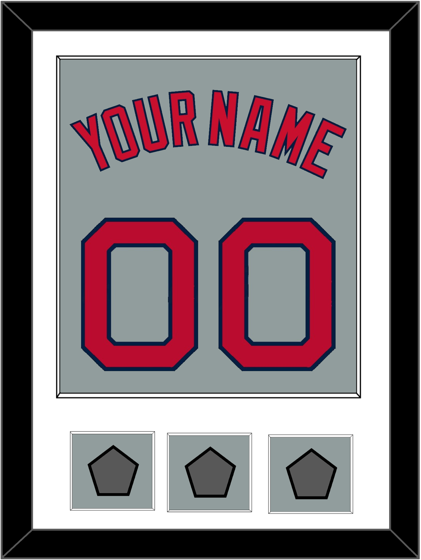 Boston Road Gray Jersey Name & Number With  Three (2004, 2007 & 2013 Or 2007, 2013 & 2018) World Series Champions Patches.  Single Mat Cut:  White Mat With Red Name, Number & Patch Mounted On A Gray Mat.  Black Frame.