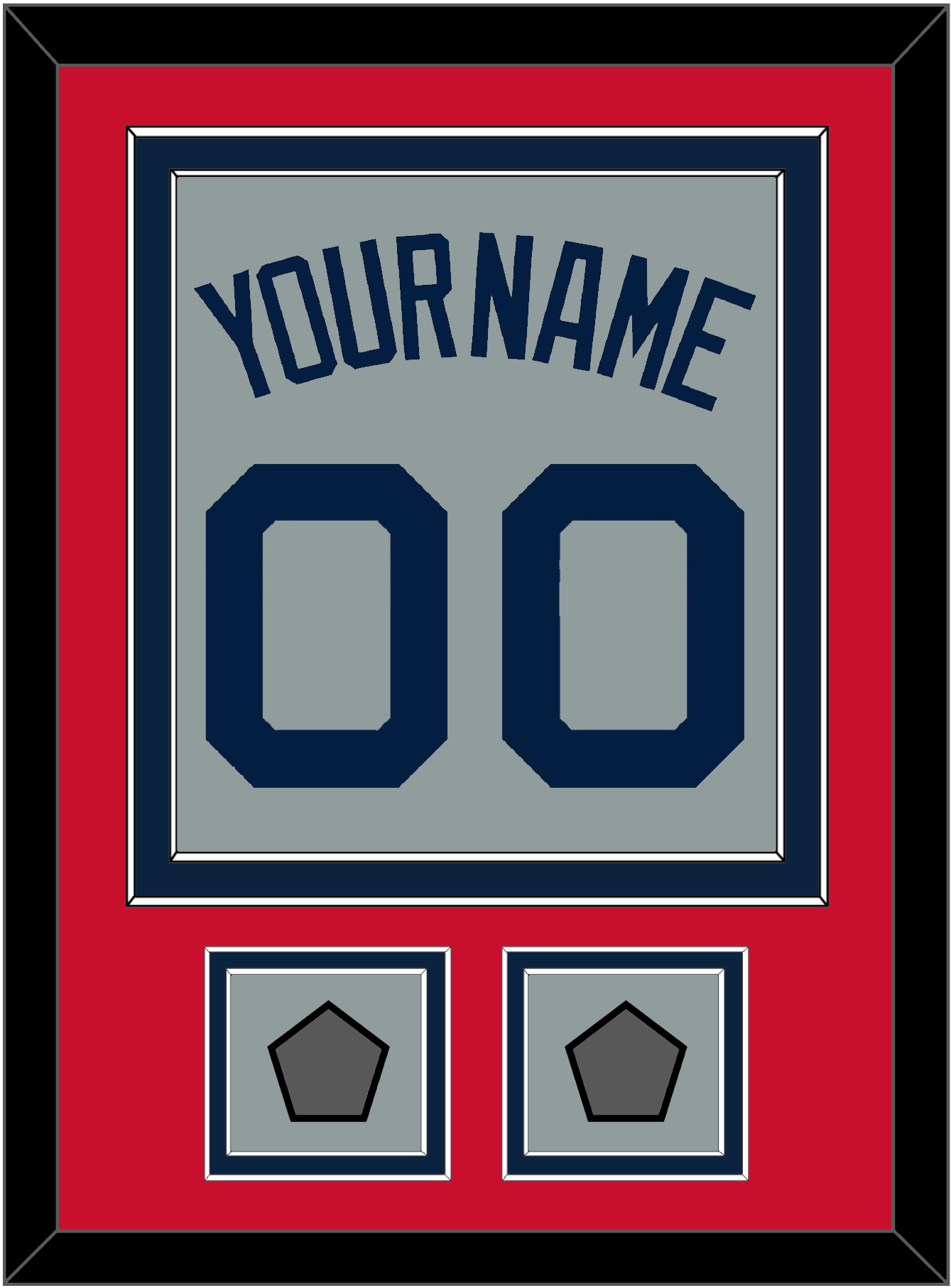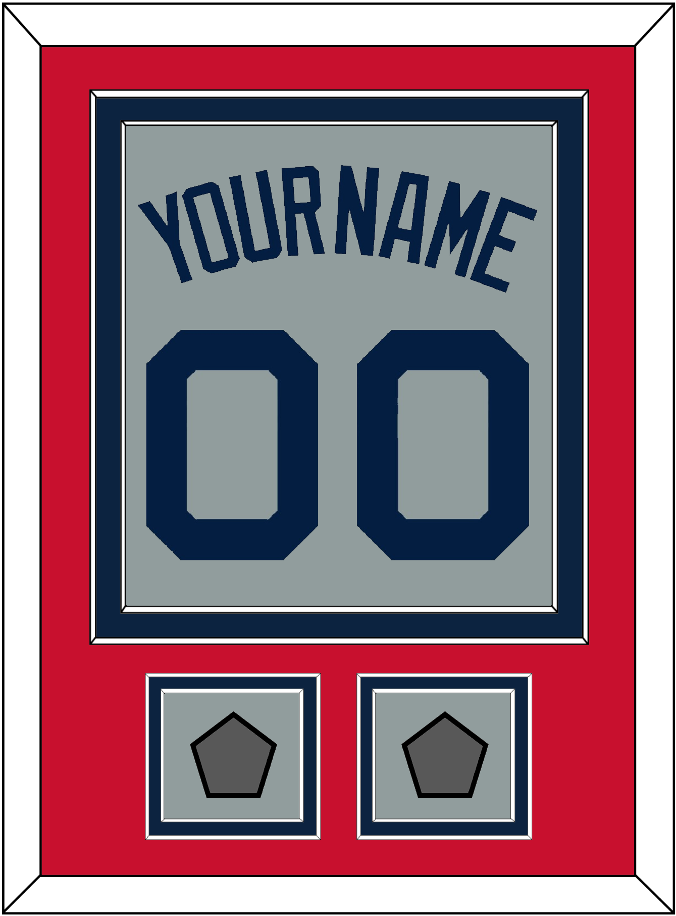 Boston Road Gray Jersey (2009 Through 2013) Name & Number With 2004 & 2007, 2007 & 2013 Or 2013 & 2018 World Series Champions Patches. Double Mat Cut: Red Mat Over A Blue Mat. Blue Name, Number & Patches Mounted On A Gray Mat. White Or Black Frame.