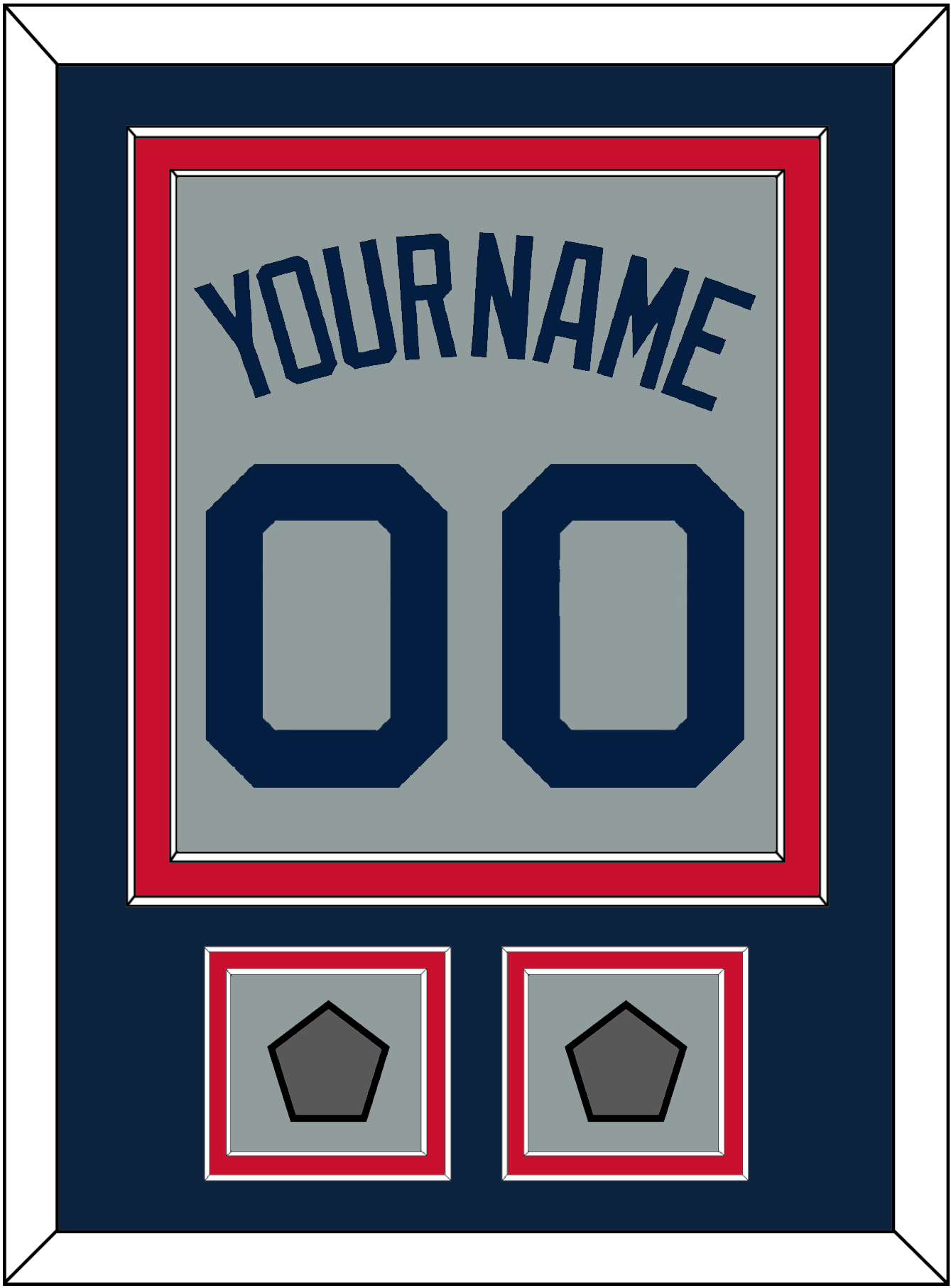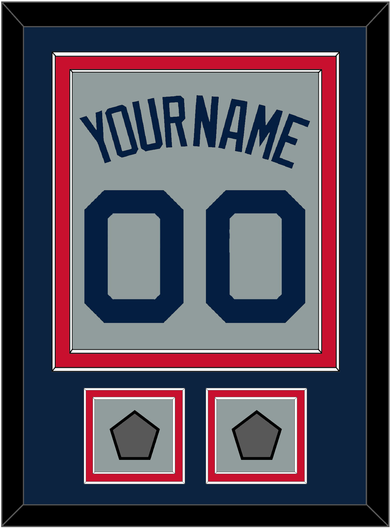 Boston Road Gray Jersey (2009 Through 2013) Name & Number With 2004 & 2007, 2007 & 2013 Or 2013 & 2018 World Series Champions Patches.  Double Mat Cut:  Blue Mat Over A Red Mat.  Blue Name, Number & Patches Mounted On A Gray Mat.  White Or Black Frame.