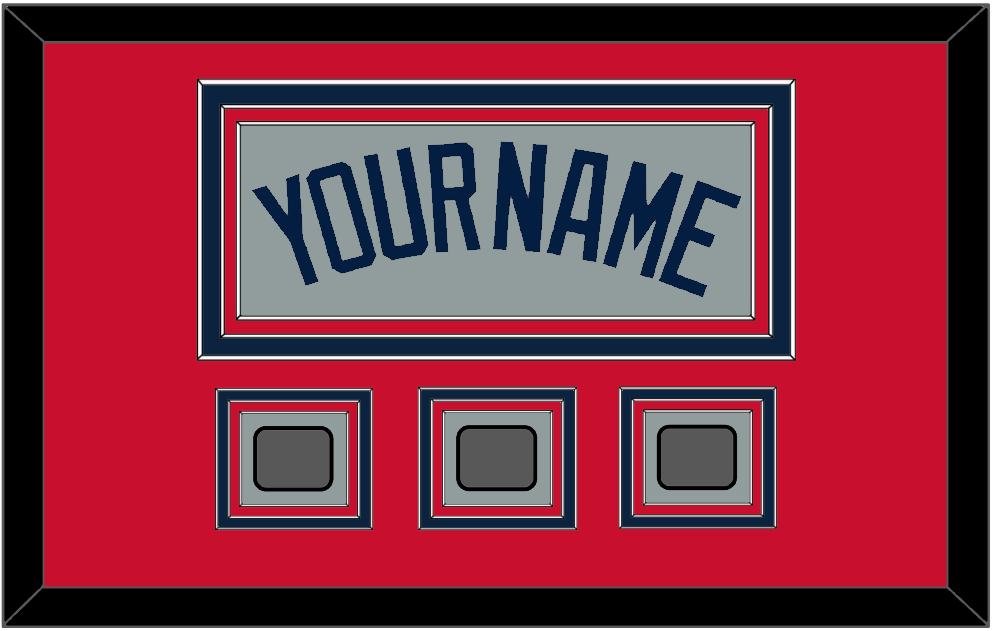 Boston Road Gray Jersey (2009 Through 2013) Name With Three World Series Champions Patches (2004, 2007 & 2013 Or 2007, 2013 & 2018). Triple Mat Cut: Red Mat Over A Blue Mat Over A Red Mat. Blue Name & Patches Mounted On A Gray Mat. White Or Black Frame.