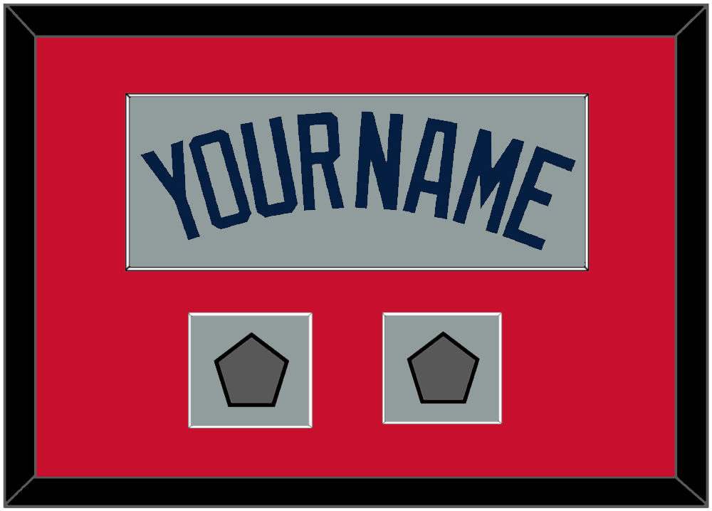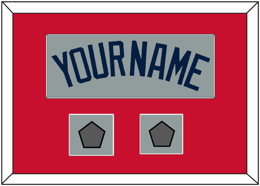 Boston Road Gray Jersey (2009 Through 2013) Name With Two World Series Champions Patches (2004 & 2007, 2007 & 2013 Or 2013 & 2018).  Single Mat Cut:  Red Mat With Blue Name & Patches Mounted On A Gray Mat.  White Or Black Frame.