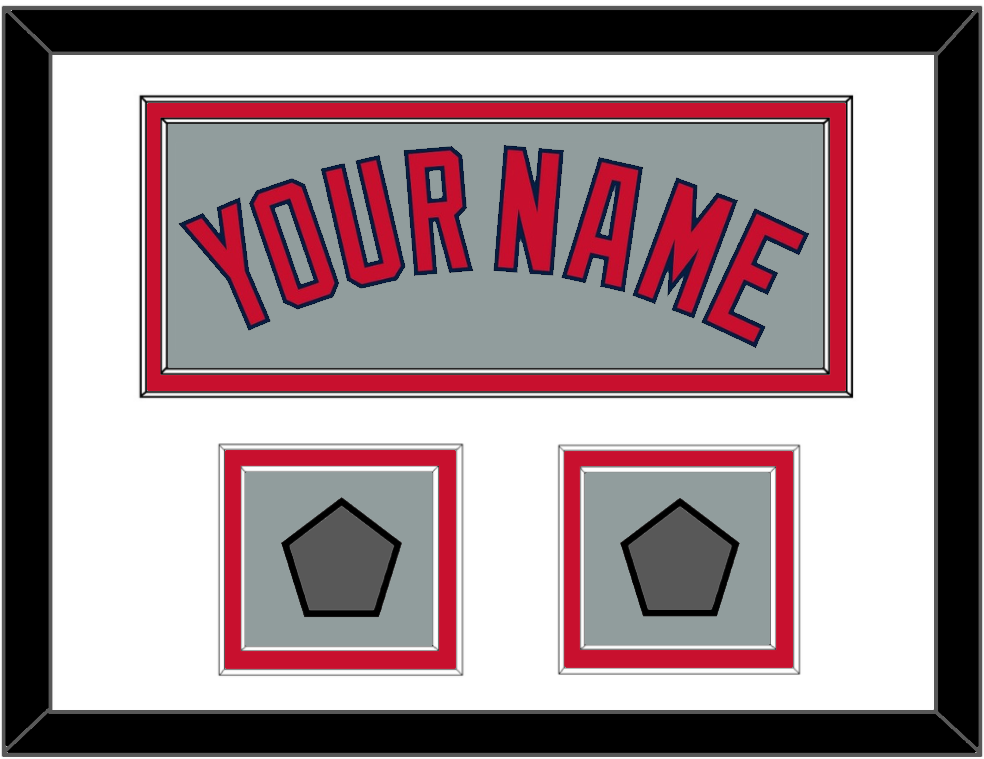 Boston Road Gray Jersey Name With Two World Series Champions Patches (2004 & 2007, 2007 & 2013 Or 2013 & 2018).  Double Mat Cut:  White Mat Over A Red Mat.  Red Name & Patches Mounted On A Gray Mat.  Black Frame.