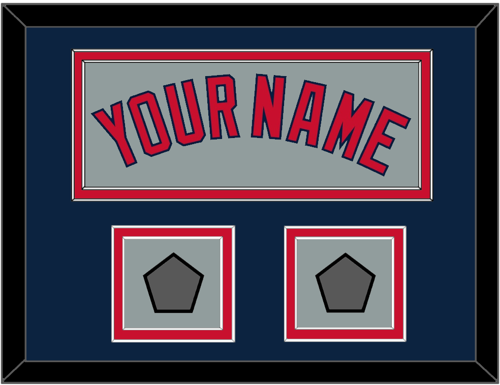 Boston Road Gray Jersey Name With Two World Series Champions Patches (2004 & 2007, 2007 & 2013 Or 2013 & 2018). Double Mat Cut: Blue Mat Over A Red Mat. Red Name & Patches Mounted On A Gray Mat. White Or Black Frame.