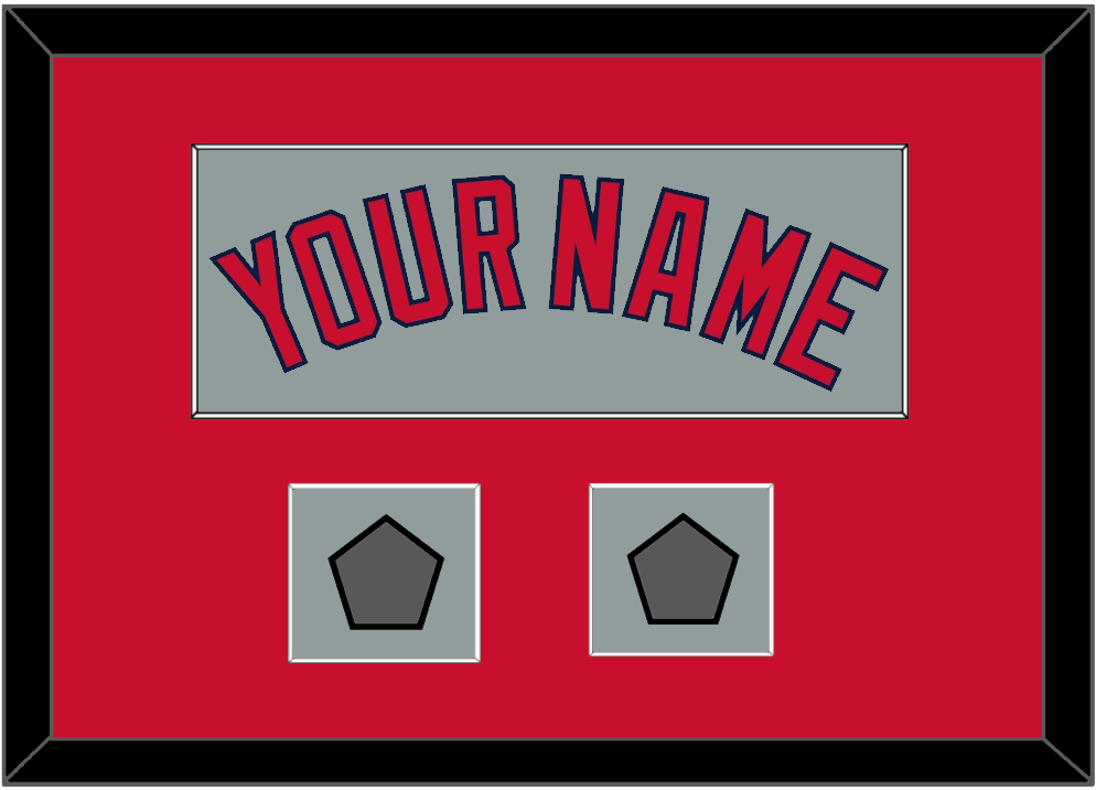 Boston Road Gray Jersey Name With Two World Series Champions Patches (2004 & 2007, 2007 & 2013 Or 2013 & 2018). Single Mat Cut: Red Mat With Red Name & Patches Mounted On A Gray Mat. White Or Black Frame.