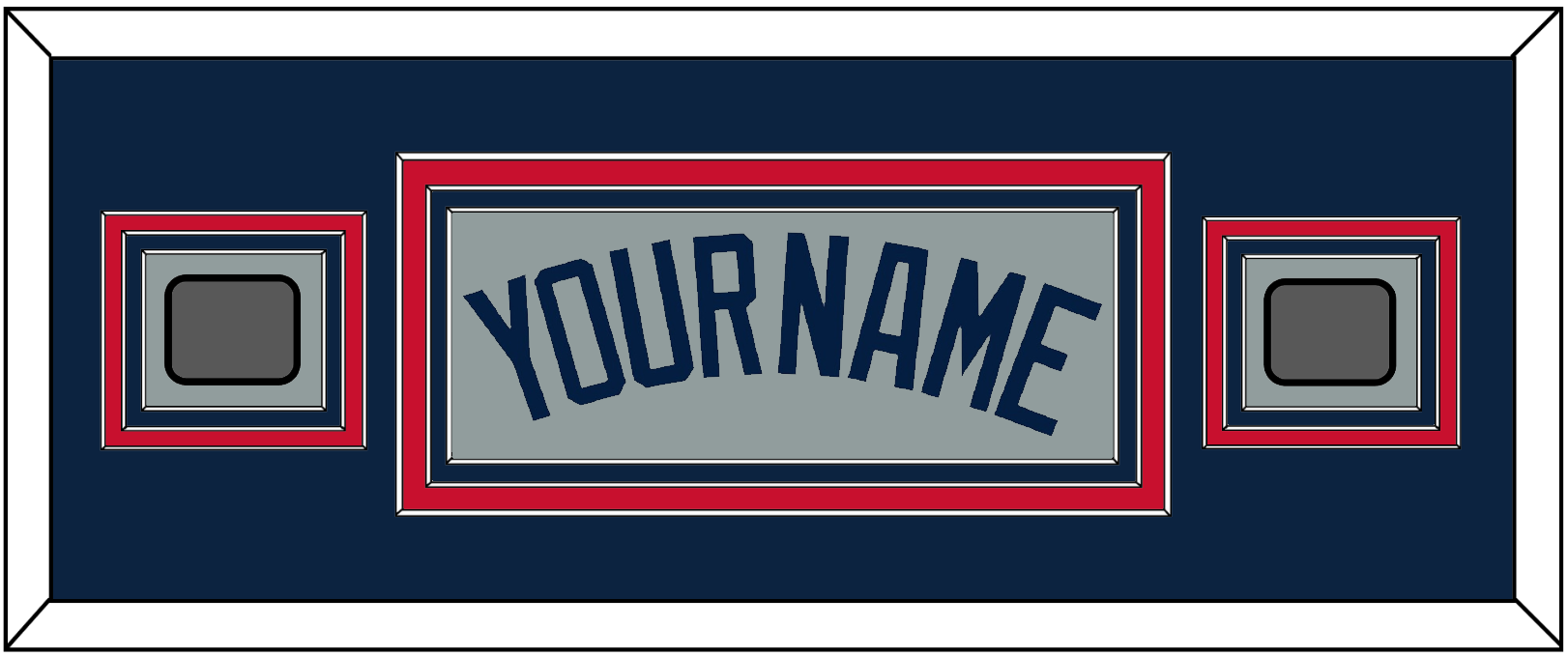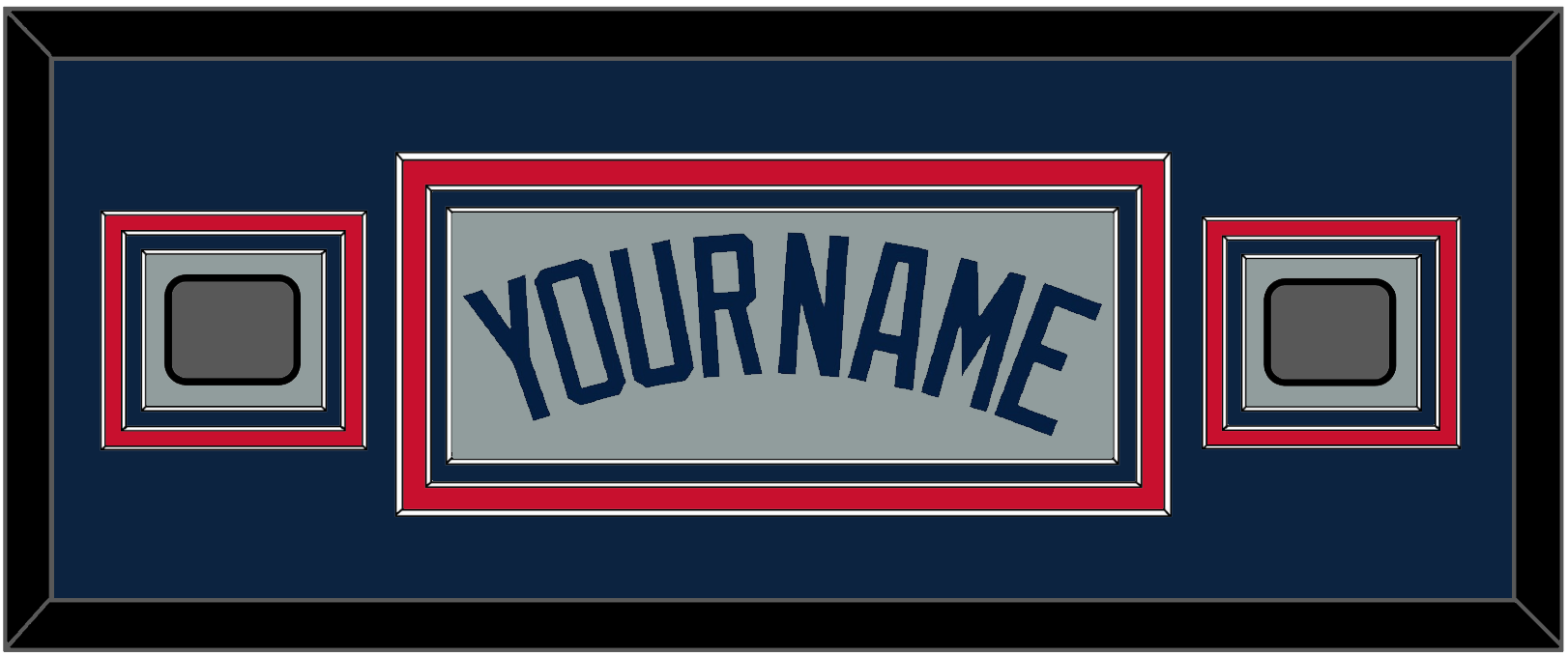 Boston Road Gray Jersey (2009 Through 2013) Name With Two World Series Champions Patches (2004 & 2007, 2007 & 2013 Or 2013 & 2018).  Triple Mat Cut:  Blue Mat Over A Red Mat Over A Blue Mat.  Blue Name & Patches Mounted On A Gray Mat.  White Or Black Frame.
