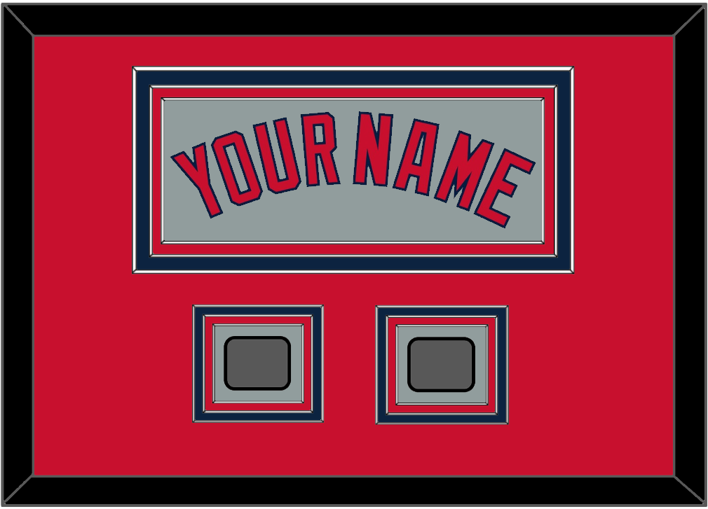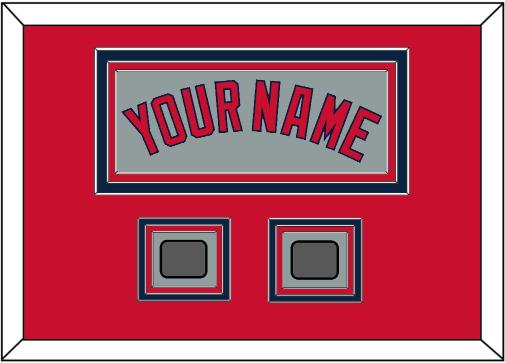 Boston Road Gray Jersey Name With Two World Series Champions Patches (2004 & 2007, 2007 & 2013 Or 2013 & 2018). Triple Mat Cut: Red Mat Over A Blue Mat Over A Red Mat. Red Name & Patches Mounted On A Gray Mat. White Or Black Frame.