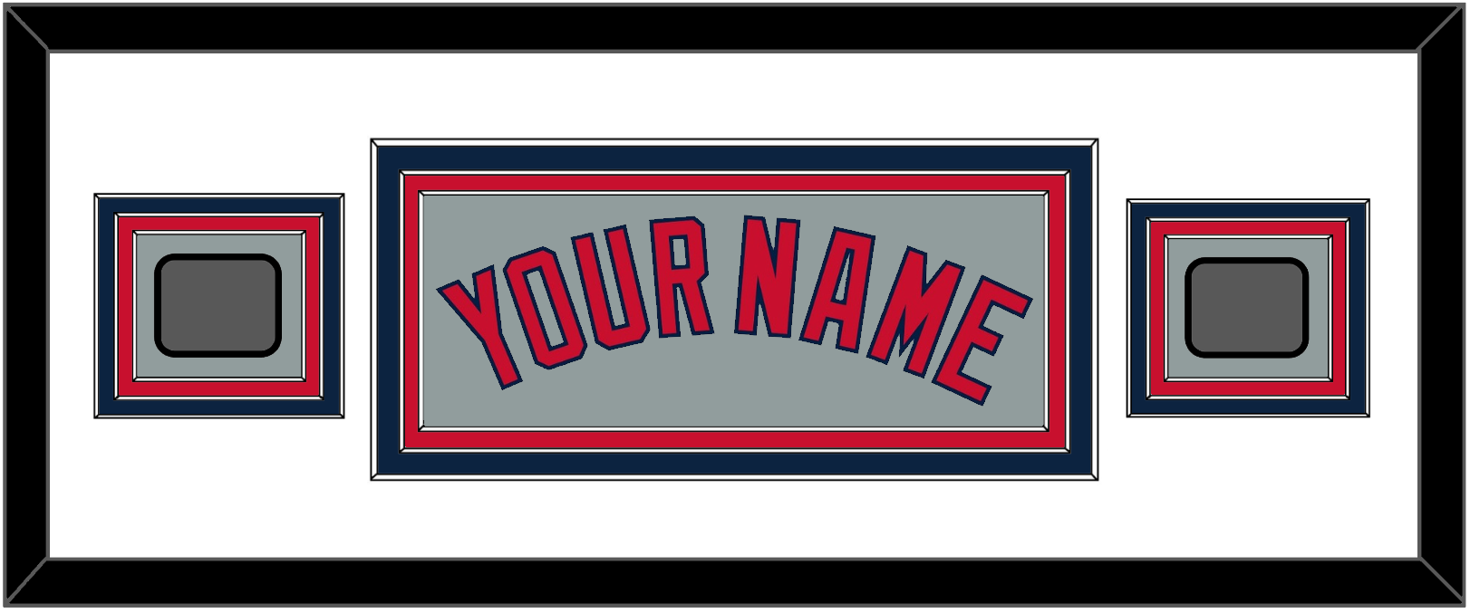 Boston Road Gray Jersey Name With Two World Series Champions Patches (2004 & 2007, 2007 & 2013 Or 2013 & 2018). Triple Mat Cut: White Mat Over A Red Mat Over A Blue Mat. Red Name & Patches Mounted On A Gray Mat. Black Frame.