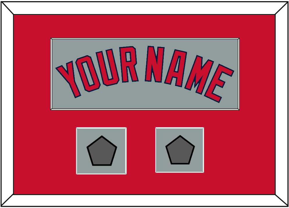 Boston Road Gray Jersey Name With Two World Series Jersey Patches (2004 & 2007, 2007 & 2013 Or 2013 & 2018). Single Mat Cut: Red Mat With Red Name & Patches Mounted On A Gray Mat. White Or Black Frame.