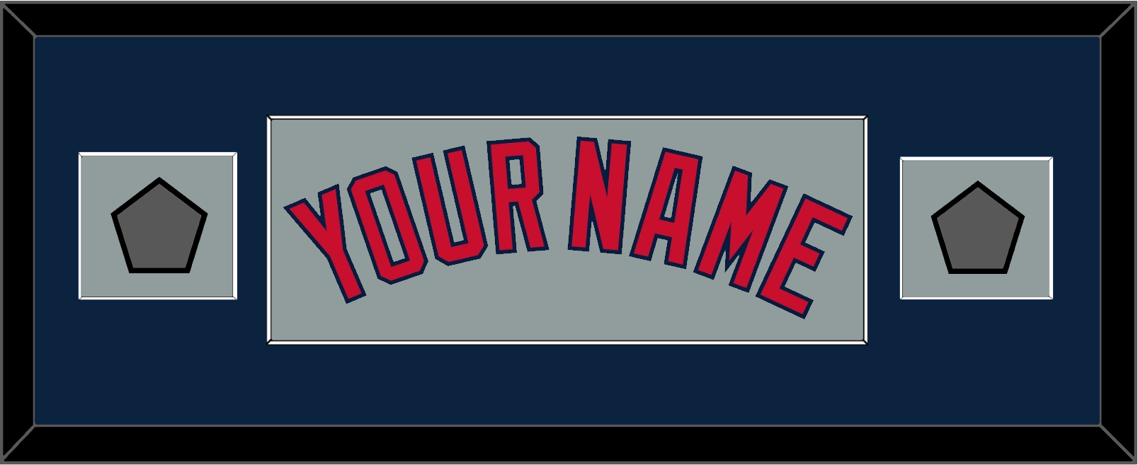 Boston Road Gray Jersey Name With Two World Series Jersey Patches (2004 & 2007, 2007 & 2013 Or 2013 & 2018). Single Mat Cut: Blue Mat With Red Name & Patches Mounted On A Gray Mat. White Or Black Frame.
