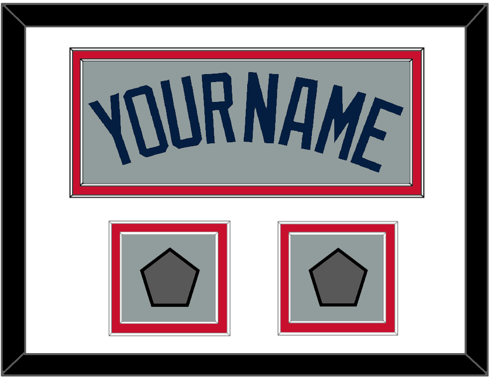 Boston Road Gray Jersey (2009 Through 2013) Name With Two World Series Jersey Patches (2004 & 2007, 2007 & 2013, Or 2013 & 2018). Double Mat Cut: White Mat Over A Red Mat. Blue Name & Patches Mounted On A Gray Mat. Black Frame.
