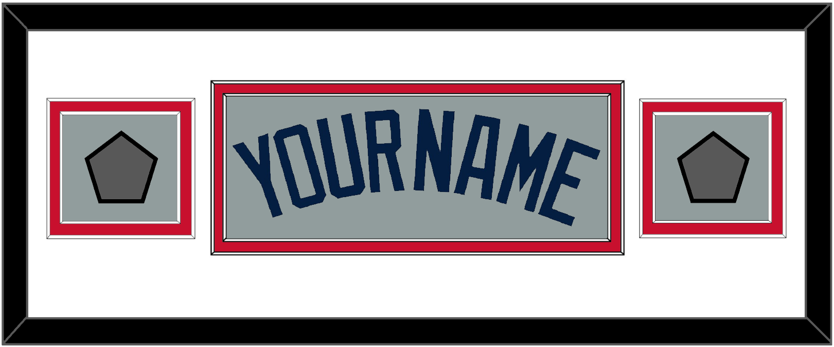 Boston Road Gray Jersey (2009 Through 2013) Name With Two World Series Jersey Patches (2004 & 2007, 2007 & 2013 Or 2013 & 2018). Double Mat Cut: White Mat Over A Red Mat. Blue Name & Patches Mounted On A Gray Mat. Black Frame.