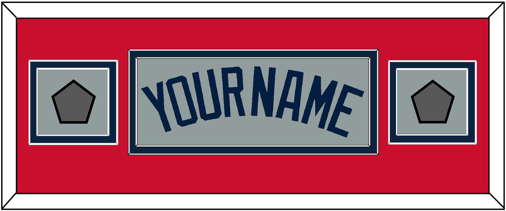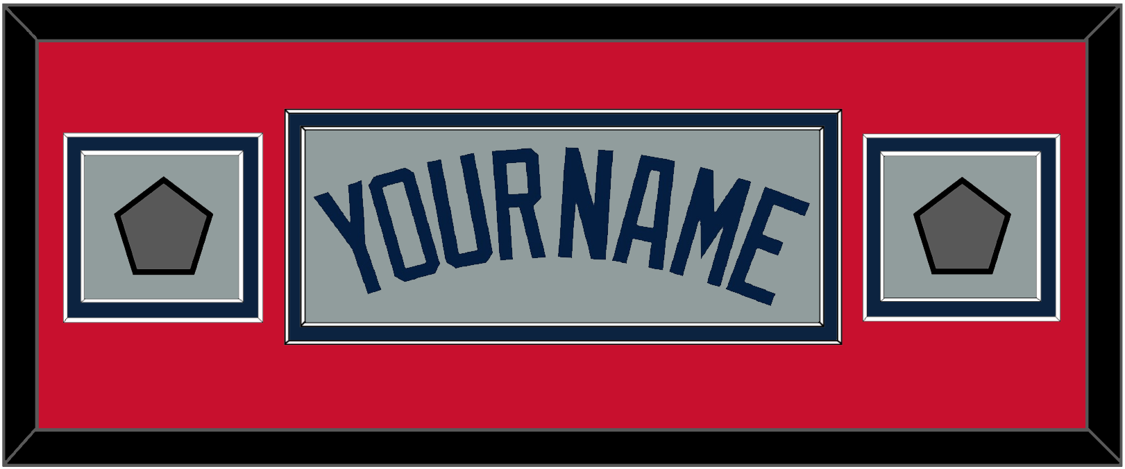 Boston Road Gray Jersey (2009 Through 2013) Name With Two World Series Jersey Patches (2004 & 2007, 2007 & 2013 Or 2013 & 2018). Double Mat Cut: Red Mat Over A Blue Mat. Blue Name & Patches Mounted On A Gray Mat. White Or Black Frame.