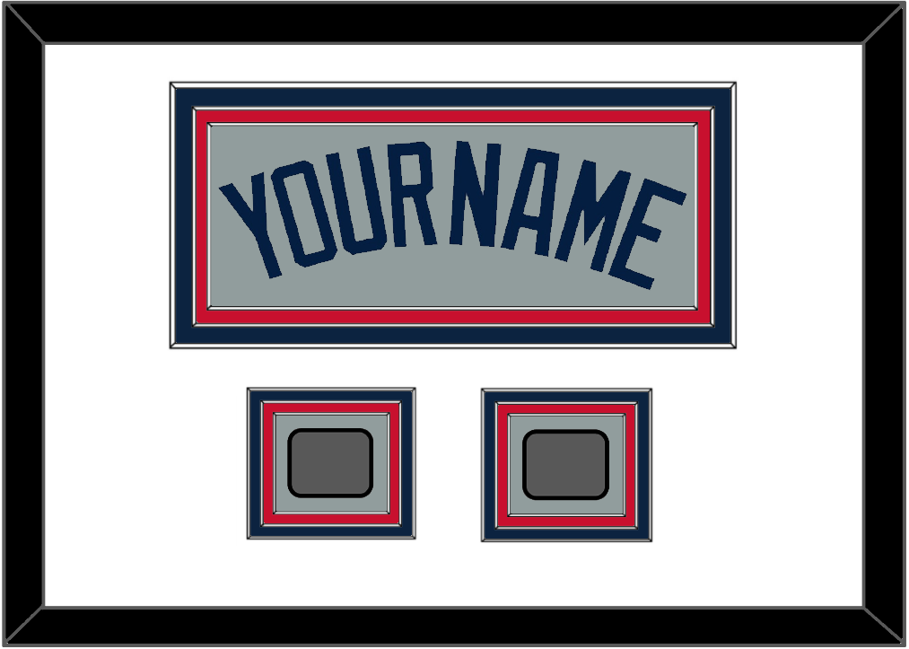 Boston Road Gray Jersey (2009 Through 2013) Name With Two World Series Jersey Patches (2004 & 2007, 2007 & 2013 Or 2013 & 2018). Triple Mat Cut: White Mat Over A Blue Mat Over A Red Mat. Blue Name & Patches Mounted On A Gray Mat. Black Frame.