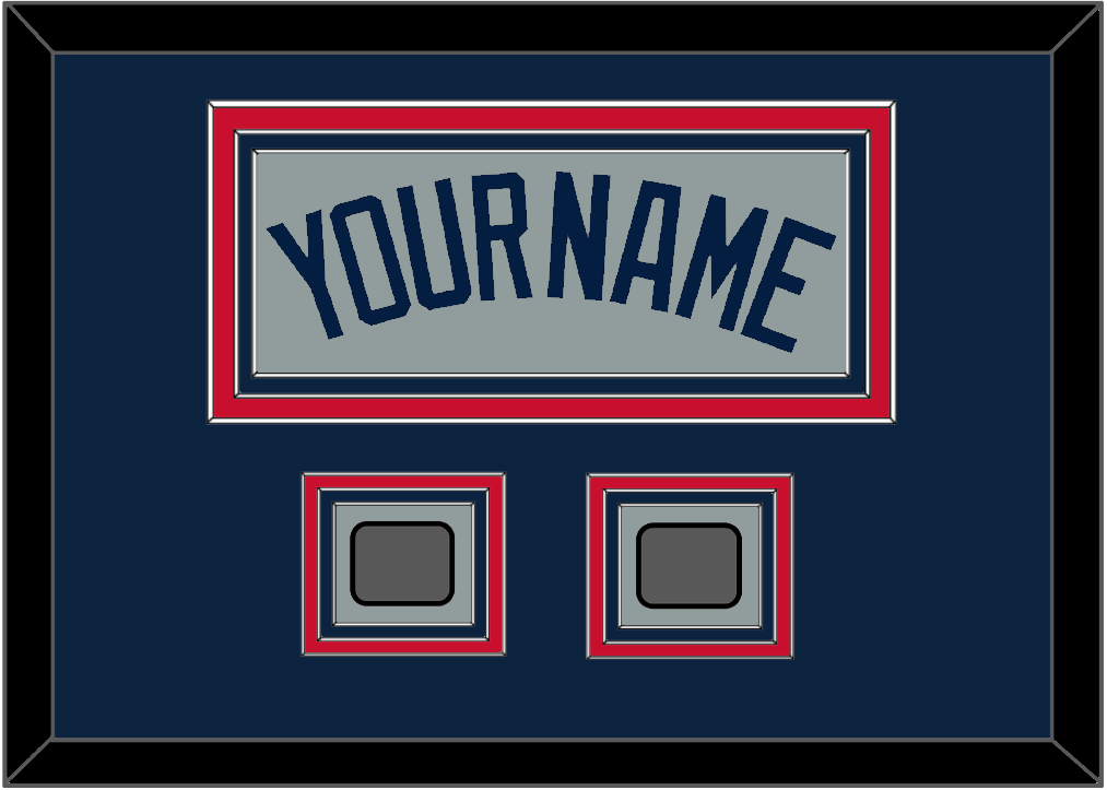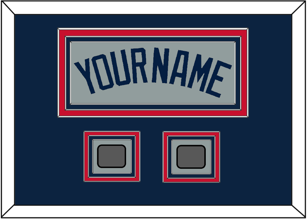 Boston Road Gray Jersey (2009 Through 2013) Name With Two World Series Jersey Patches (2004 & 2007, 2007 & 2013 Or 2013 & 2018). Triple Mat Cut: Blue Mat Over A Red Mat Over A Blue Mat. Blue Name & Patches Mounted On A Gray Mat. White Or Black Frame.