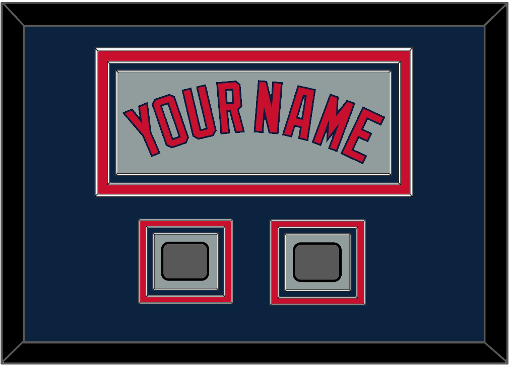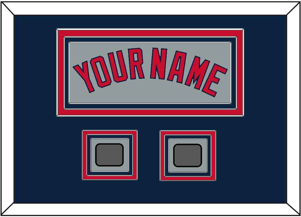 Boston Road Gray Jersey Name With Two World Series Jersey Patches (2004 & 2007, 2007 & 2013 Or 2013 & 2018). Triple Mat Cut: Blue Mat Over A Red Mat Over A Blue Mat. Red Name & Patches Mounted On A Gray Mat. White Or Black Frame.
