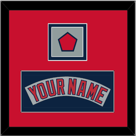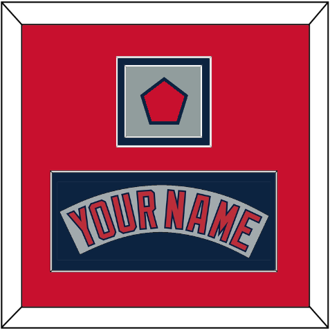 Boston Road Gray Jersey (1992 Through 2008) Nameplate With Logo Patch From Sleeve. Nameplate Is Single Mat Cut: Red Mat With Nameplate Mounted On A Blue Mat. To Match The Jersey, The Patch Is Double Mat Cut: Red Mat Over A Blue Mat With Patch Mounted On A Gray Mat. White Or Black Frame.