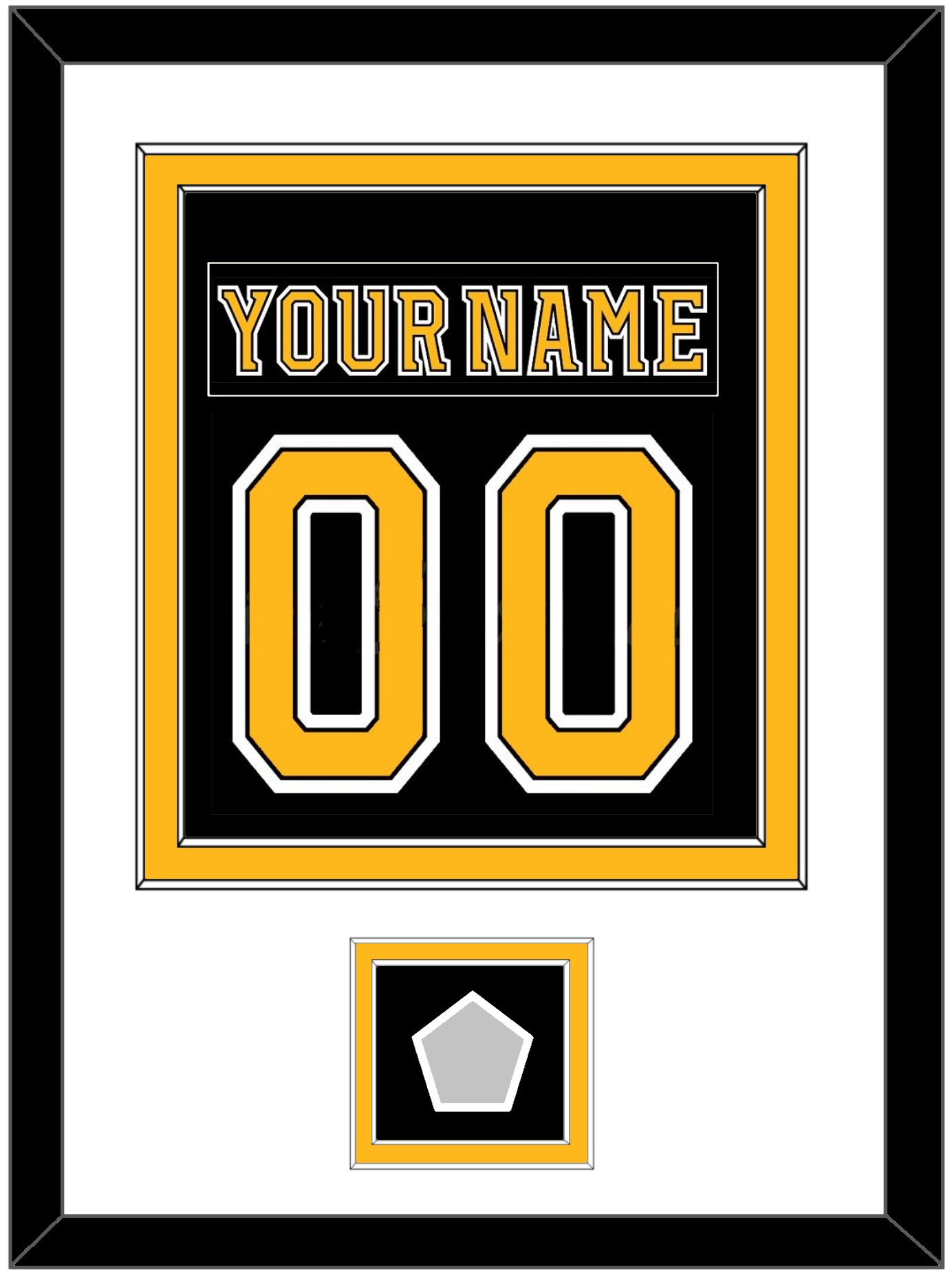 Boston Home Black Jersey (2007 Through 2017) Nameplate & Numbers (From The Back Of The Jersey) With 2011 Stanley Cup Champions Patch. Nameplate Is Double Mat Cut: White Mat Over A Gold Mat. Black Nameplate, Gold Numbers & Patch Mounted On A Black Mat. Black Frame.
