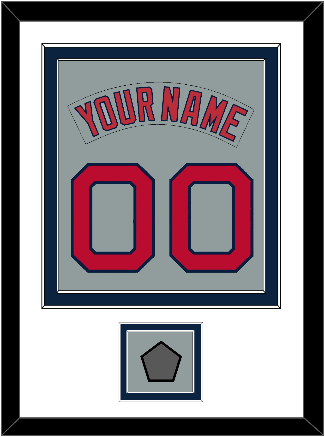Boston Road Gray Jersey (1992 Through 2008) Nameplate & Number (From The Back Of The Jersey) With 2004, 2007, 2013 Or 2018 World Series Jersey Patch.  Double Mat Cut:  White Mat Over A Blue Mat.  Gray Nameplate, Red Number & Patch Mounted On A Gray Mat.  Black Frame.