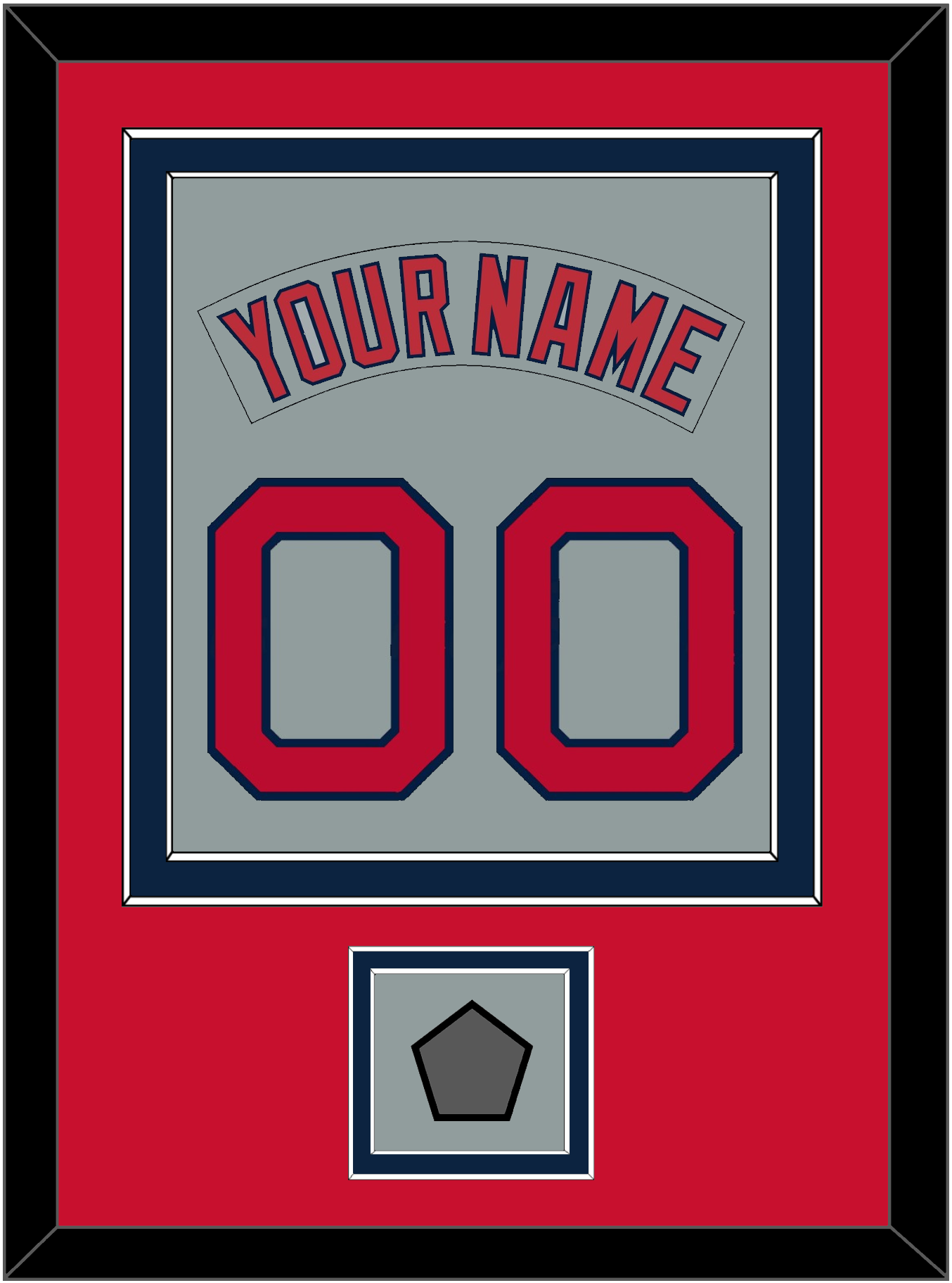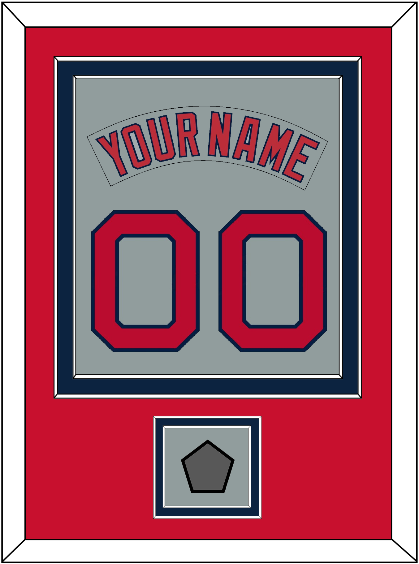 Boston Road Gray Jersey (1992 Through 2008) Nameplate & Number (From The Back Of The Jersey) With 2004, 2007, 2013 Or 2018 World Series Jersey Patch. Double Mat Cut: Red Mat Over A Blue Mat. Gray Nameplate, Red Number & Patch Mounted On A Gray Mat. White Or Black Frame.