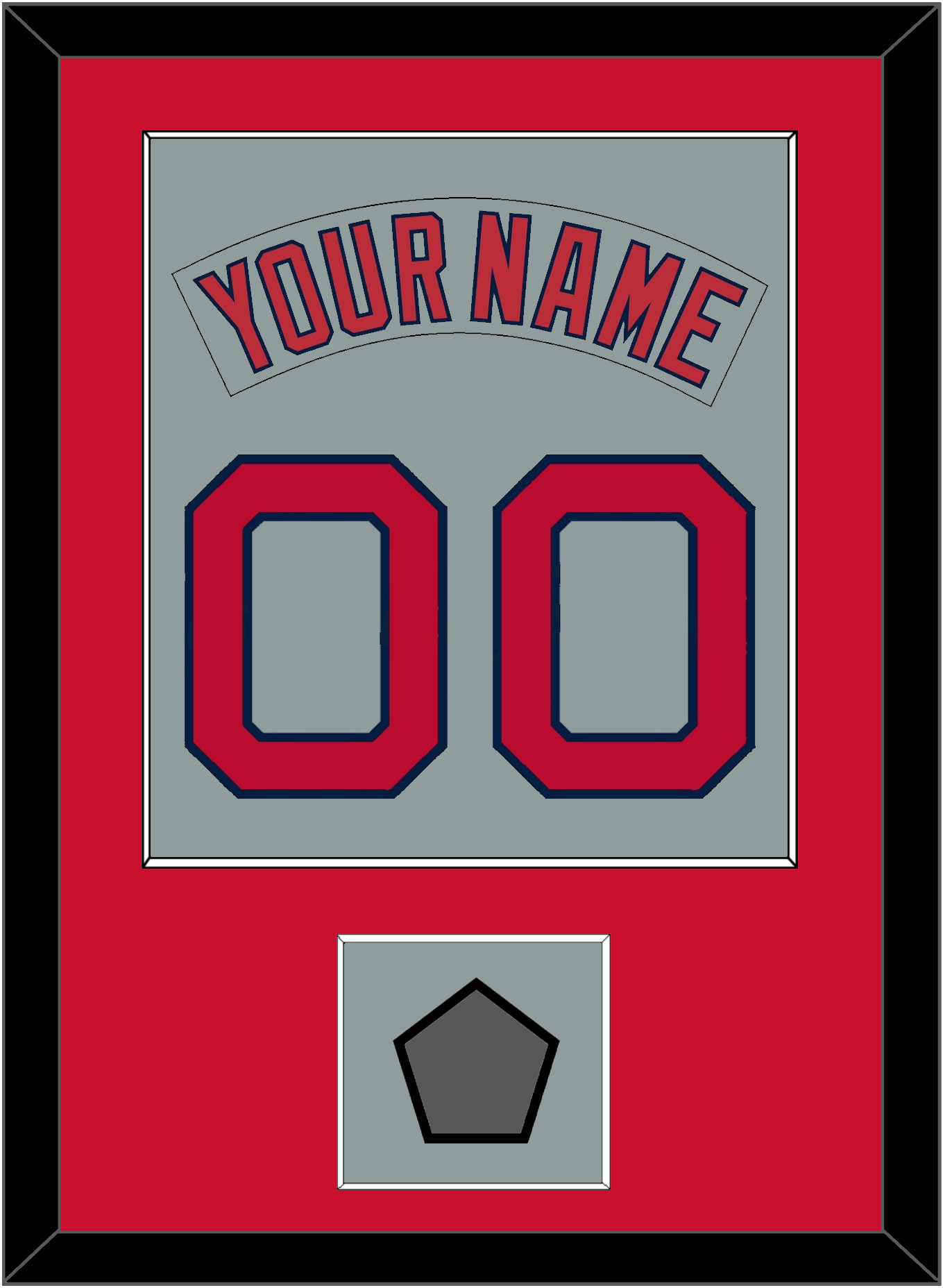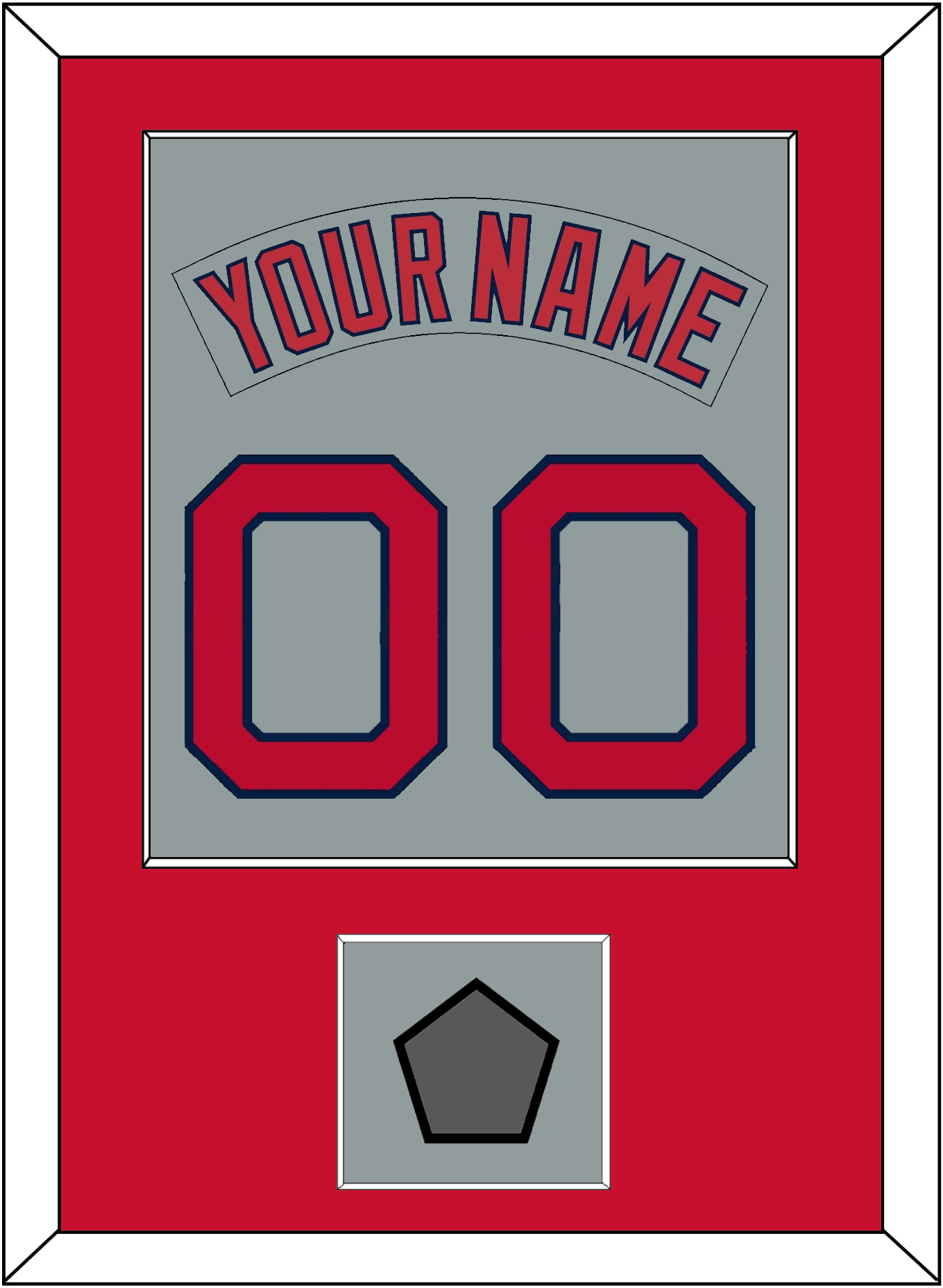 Boston Road Gray Jersey (1992 Through 2008) Nameplate & Number (From The Back Of The Jersey) With 2004, 2007, 2013 Or 2018 World Series Jersey Patch. Single Mat Cut: Red Mat With Gray Nameplate, Red Number & Patch Mounted On A Gray Mat. White Or Black Frame.