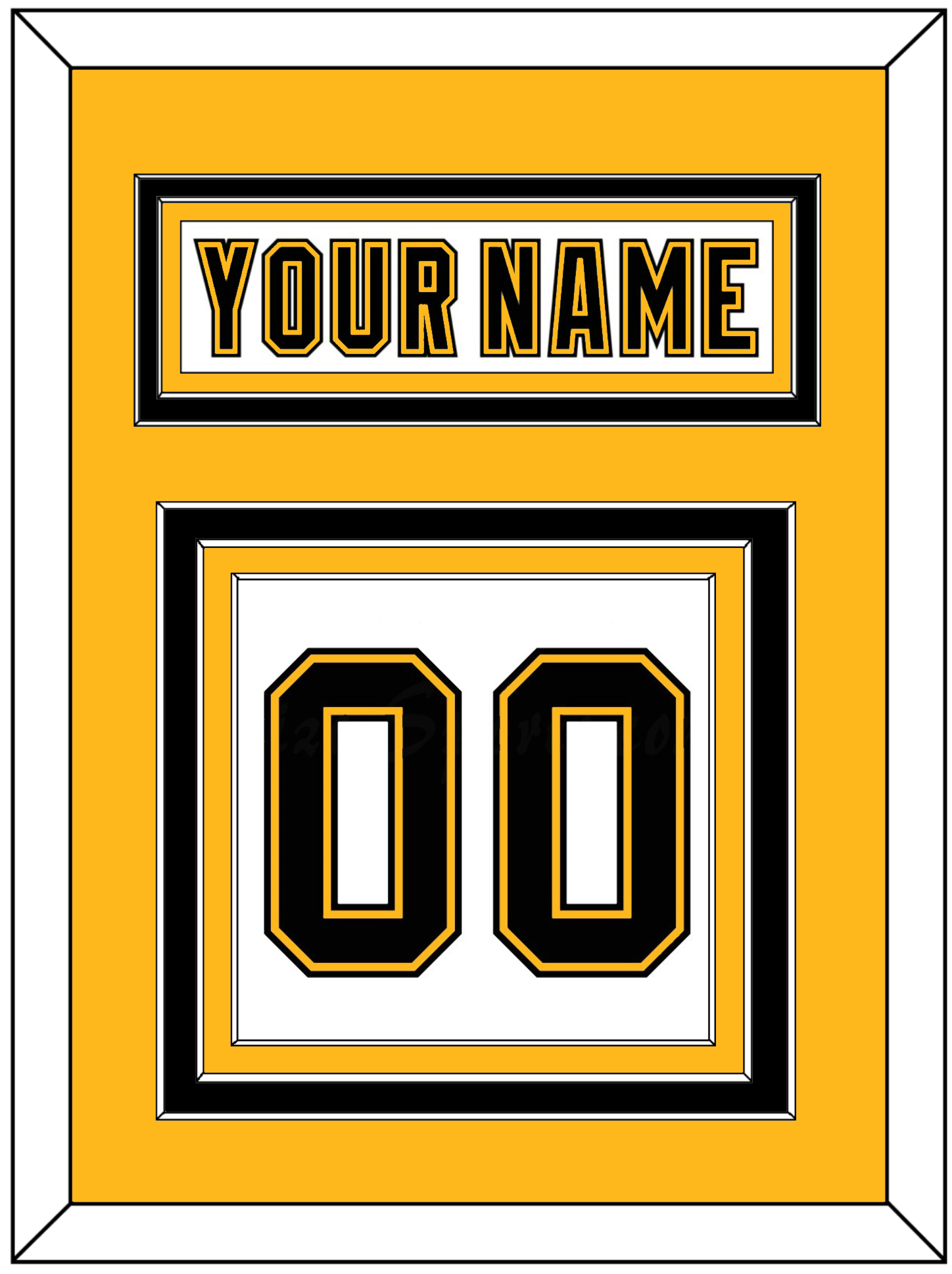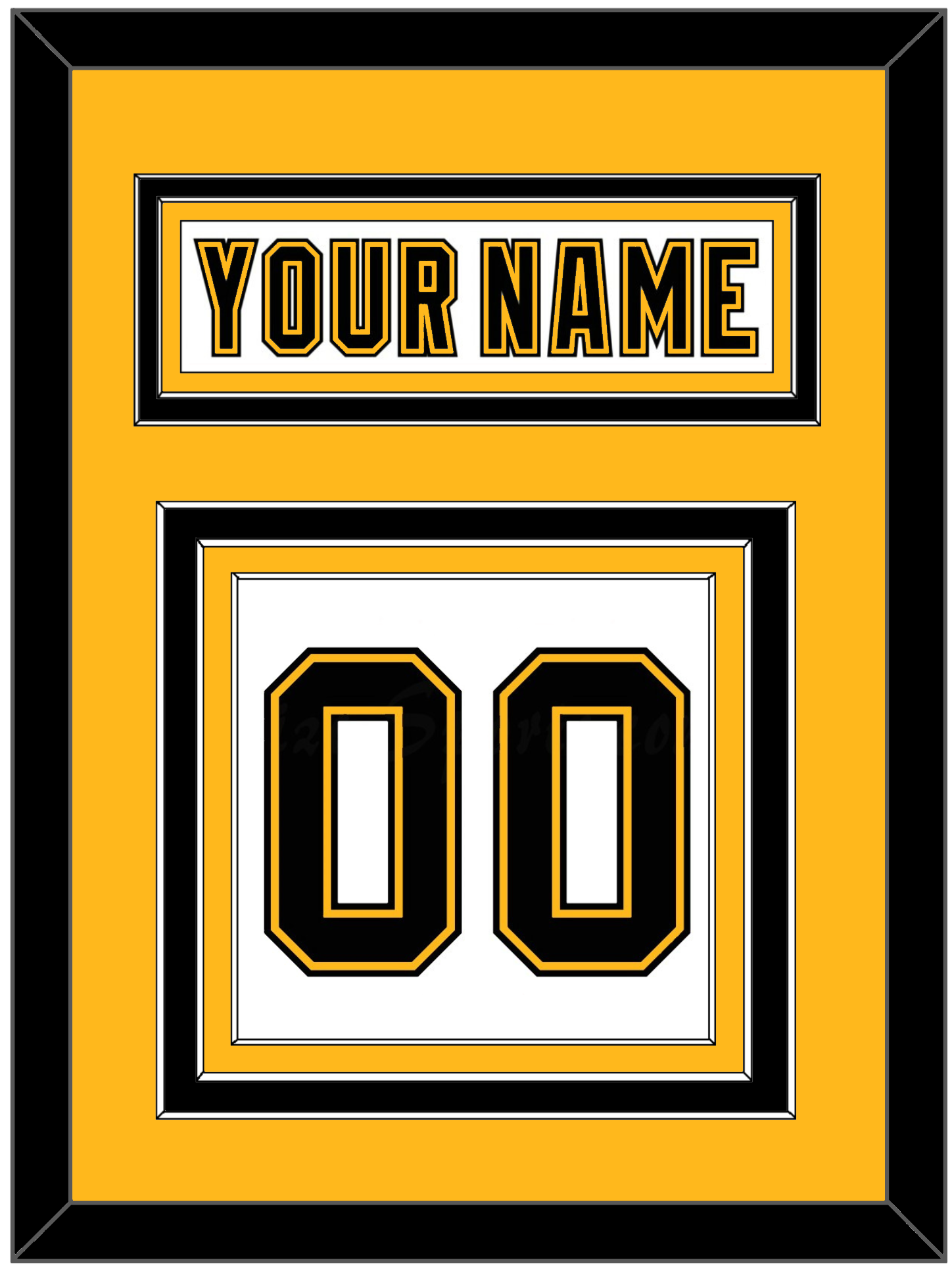Boston Home / Road White Jersey (1995 Through 2007) Nameplate & Numbers (From The Back Of The Jersey).  Nameplate Is Double Mat Cut:  Gold Mat Over A Black Mat.  White Nameplate Mounted On A Gold Mat.  To Match The Jersey, Number Is Triple Mat Cut:  Black Mat Over A Black Mat Over A Gold Mat, Black Number Mounted On A White Mat.  Black & White Frame.