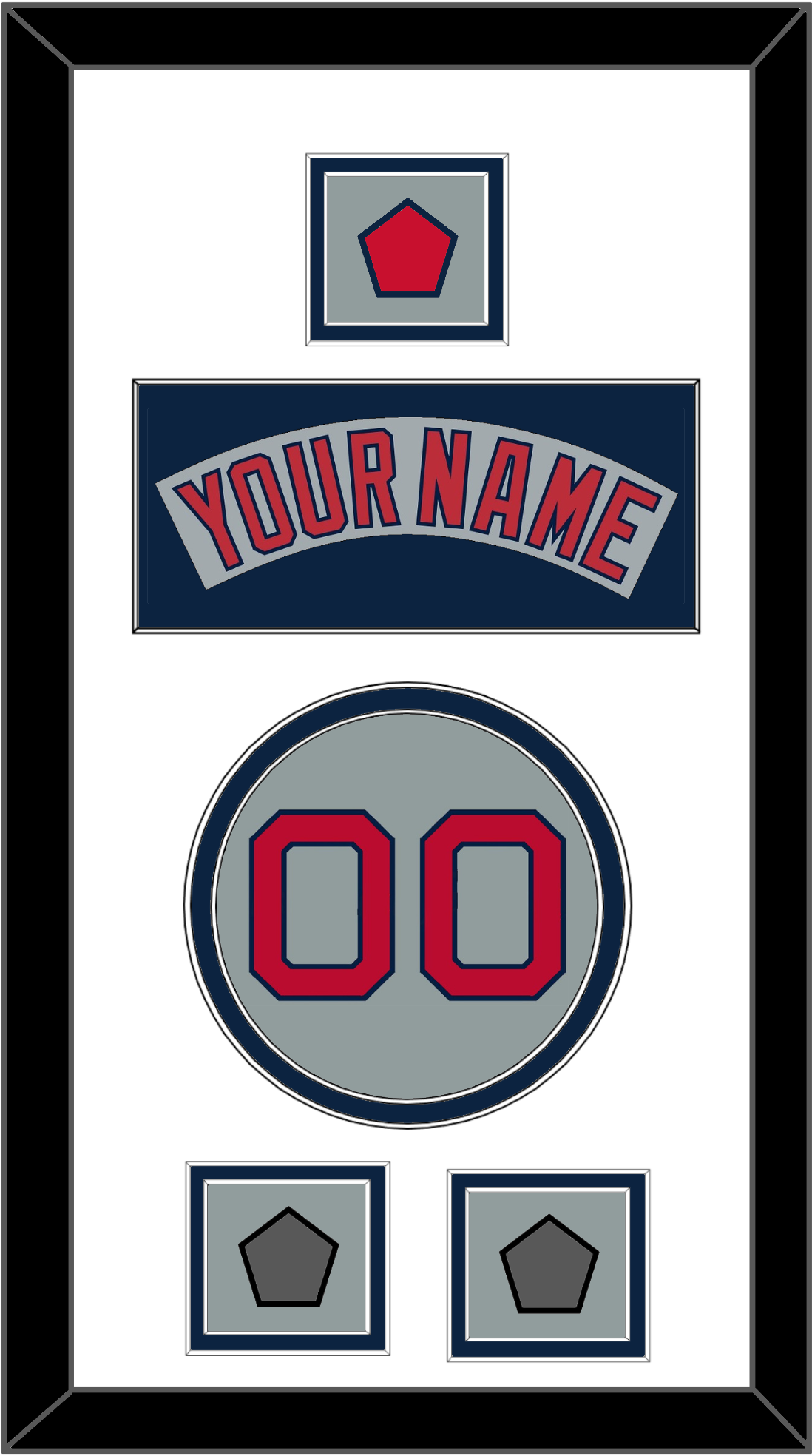 Boston Road Gray Jersey (1992 Through 2008) Nameplate, Number, Logo Sleeve Patch And Two World Series Champions Patches (2004 & 2007, 2007 & 2013 Or 2013 & 2018). Nameplate Is Single Mat Cut: White Mat With Gray Nameplate Mounted On A Blue Mat. To Match The Jersey, Number And Patches Are Double Mat Cut: White Mat Over A Blue Mat, Red Number & Patches Mounted On A Gray Mat. Black Frame.
