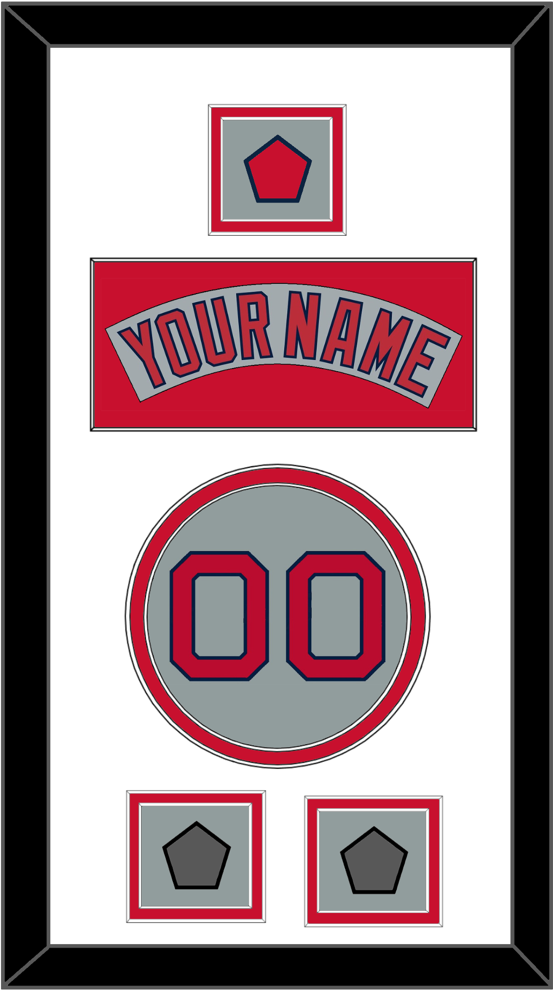 Boston Road Gray Jersey (1992 Through 2008) Nameplate, Number, Logo Sleeve Patch And Two World Series Champions Patches (2004 & 2007, 2007 & 2013 Or 2013 & 2018).  Nameplate Is Single Mat Cut:  White Mat With Gray Nameplate Mounted On A Red Mat.  To Match The Jersey, Number And Patches Are Double Mat Cut:  White Mat Over A Red Mat, Red Number & Patches Mounted On A Gray Mat.  Black Frame.