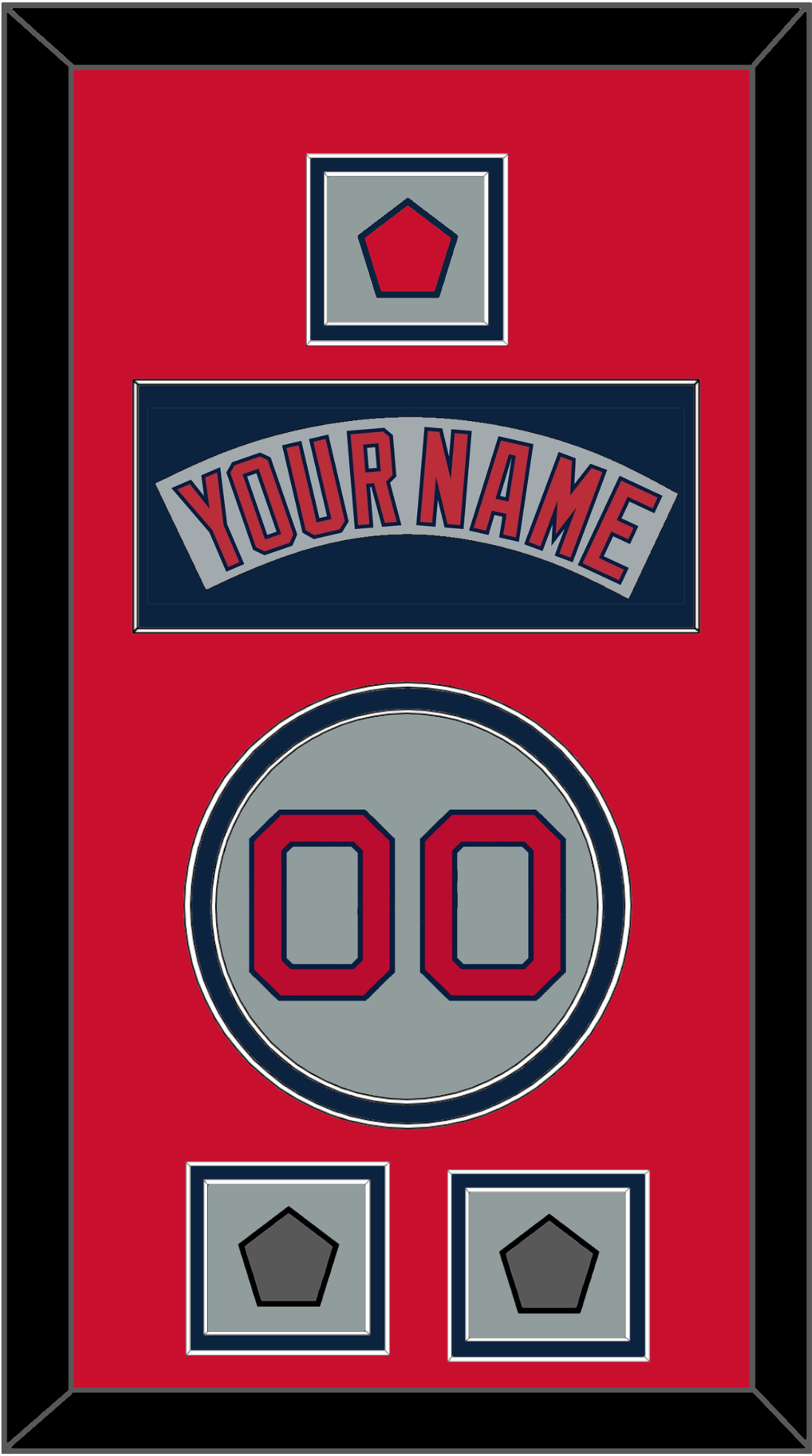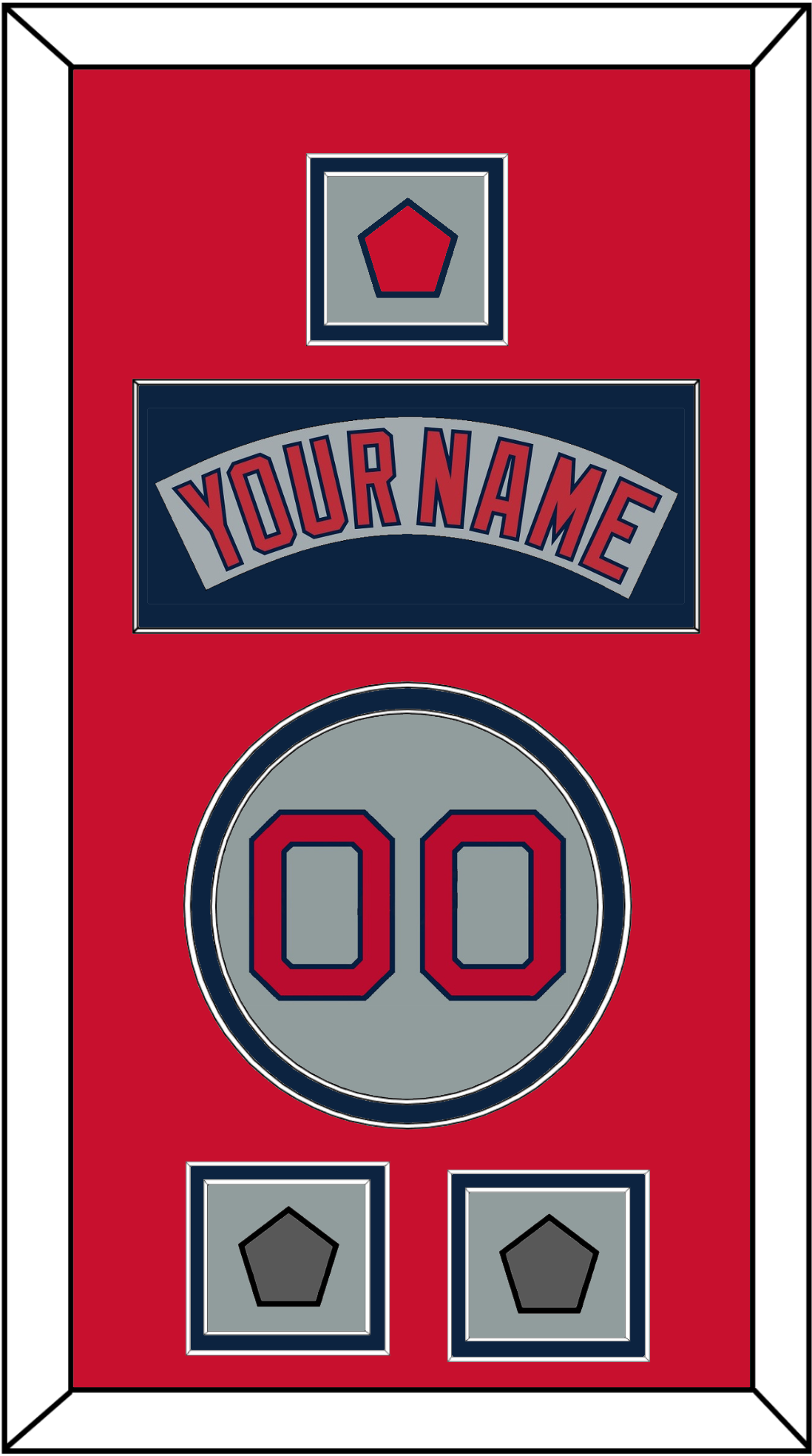 Boston Road Gray Jersey (1992 Through 2008) Nameplate, Number, Logo Sleeve Patch And Two World Series Champions Patches (2004 & 2007, 2007 & 2013 Or 2013 & 2018).  Nameplate Is Single Mat Cut:  Red Mat With Gray Nameplate Mounted On A Blue Mat.  To Match The Jersey, Number And Patches Are Double Mat Cut:  Red Mat Over A Blue Mat, Red Number & Patches Mounted On A Gray Mat.  White Or Black Frame.