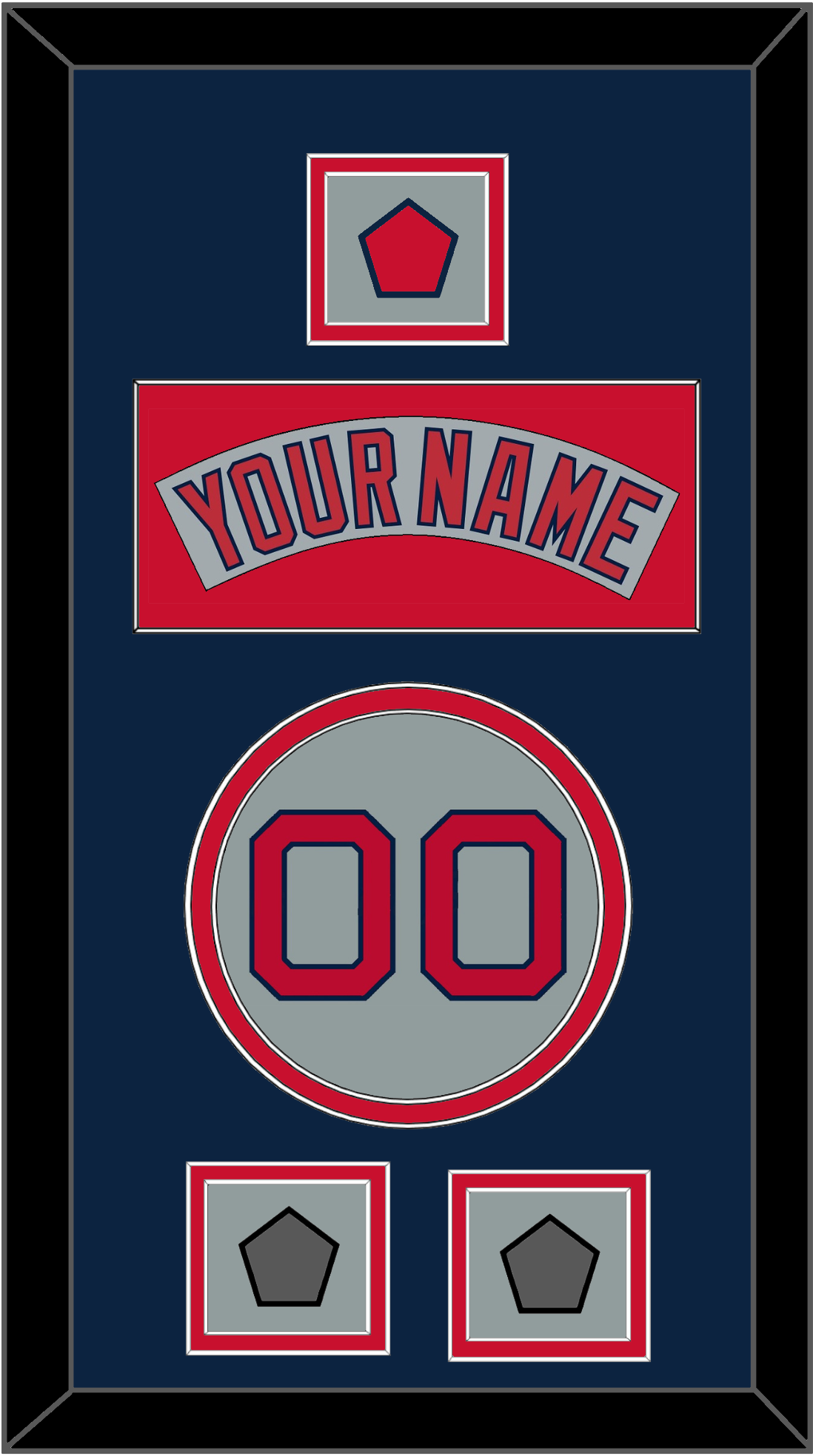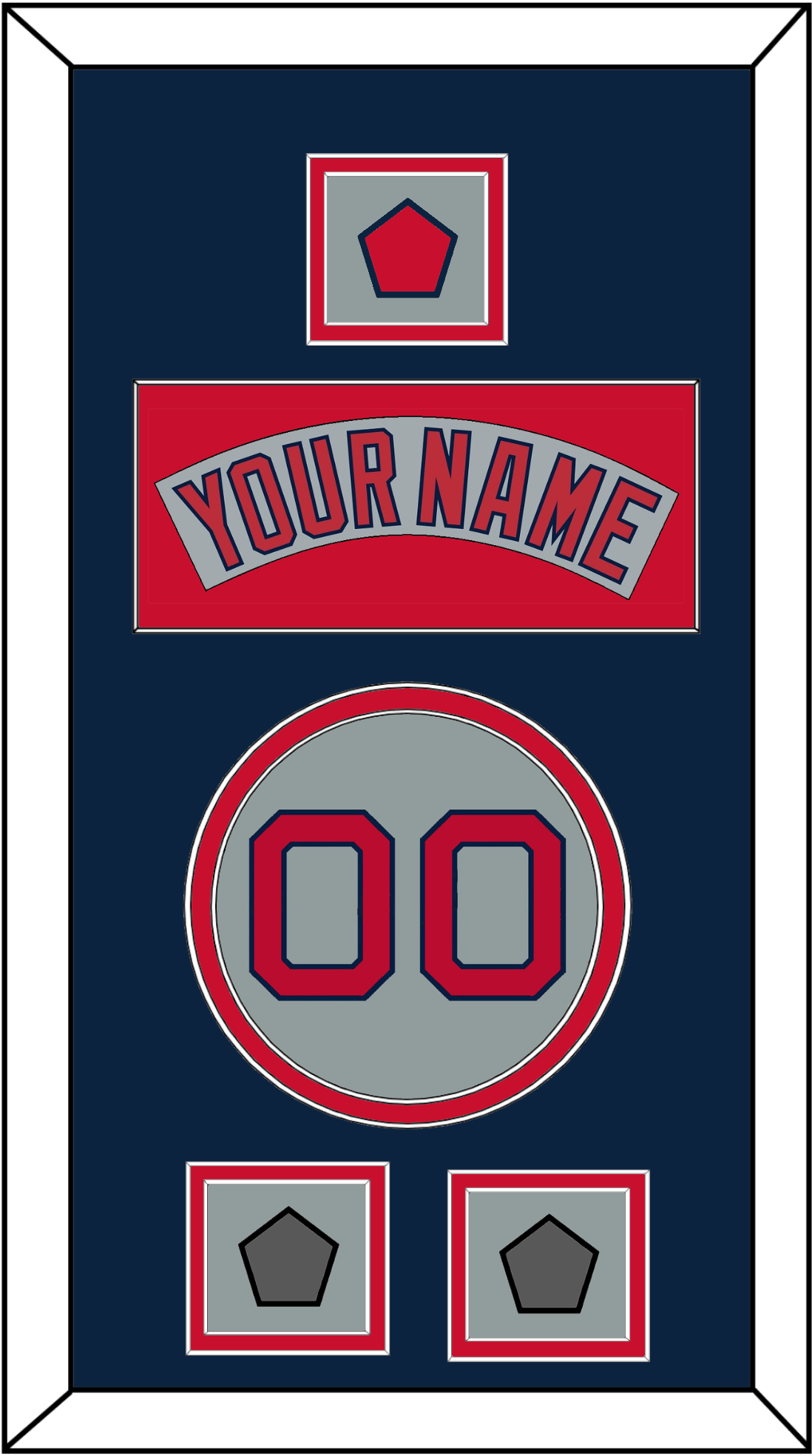 Boston Road Gray Jersey (1992 Through 2008) Nameplate, Number, Logo Sleeve Patch And Two World Series Champions Patches (2004 & 2007, 2007 & 2013 Or 2013 & 2018). Nameplate Is Single Mat Cut: Blue Mat With Gray Nameplate Mounted On A Red Mat. To Match The Jersey, Number And Patches Are Double Mat Cut: Blue Mat Over A Red Mat, Red Number & Patches Mounted On A Gray Mat. White Or Black Frame.