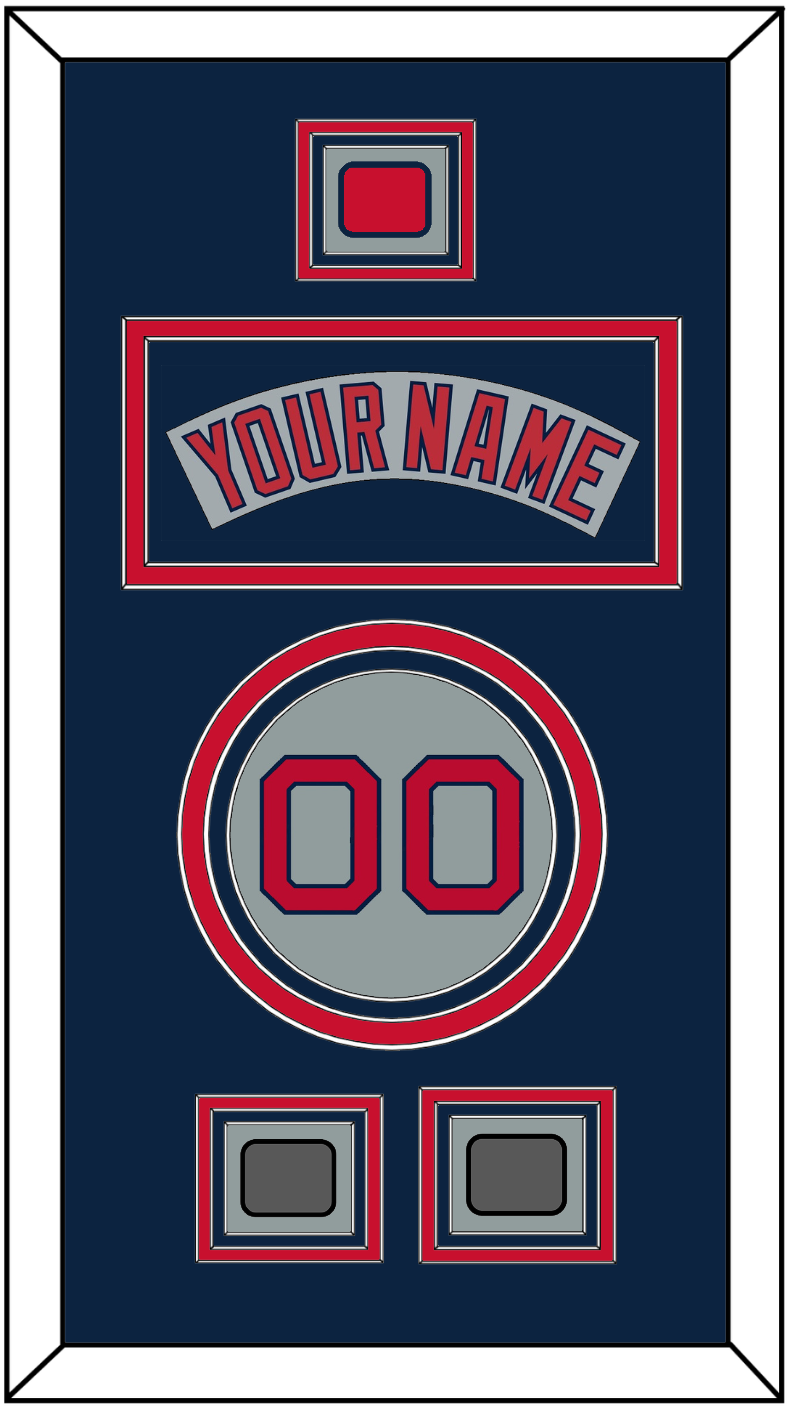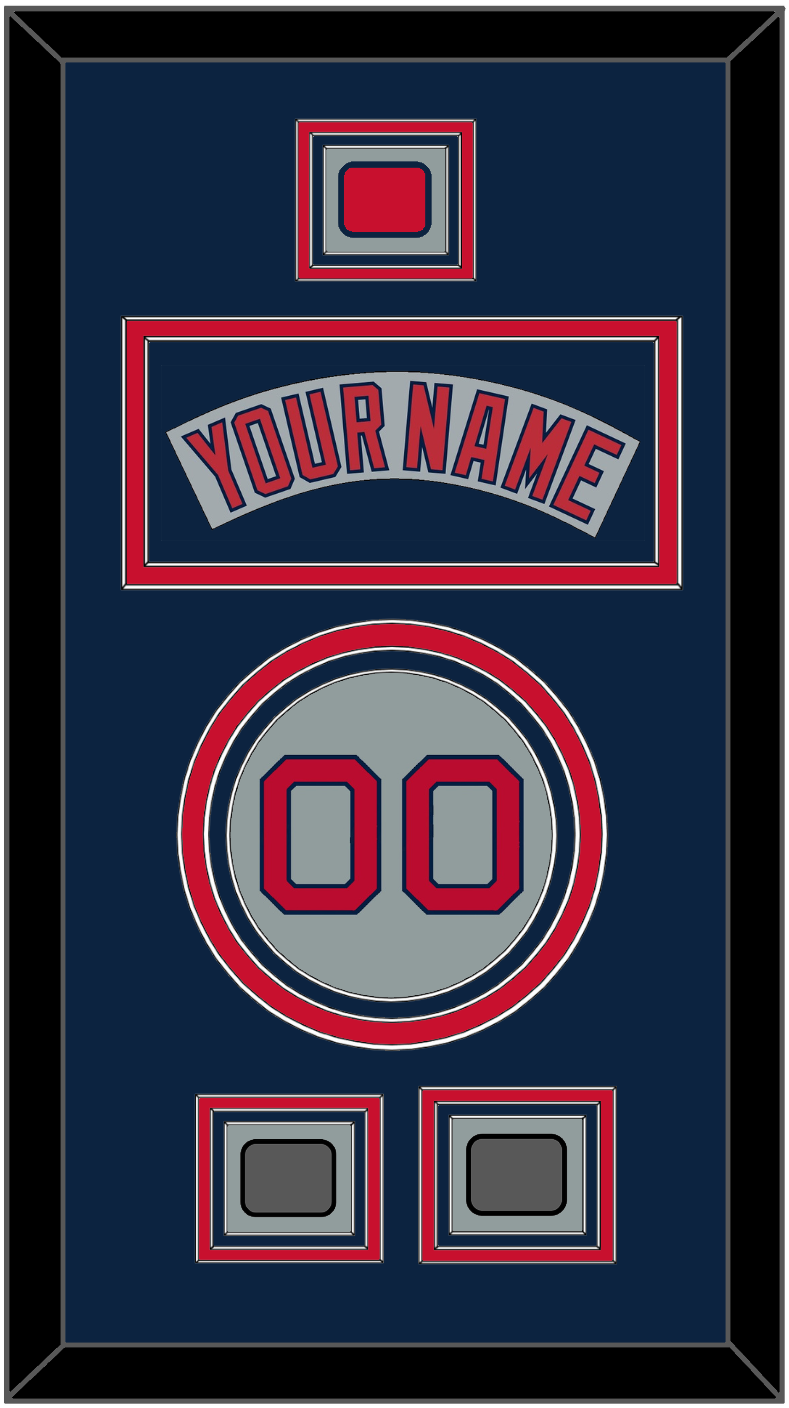 Boston Road Gray Jersey (1992 Through 2008) Nameplate, Number, Logo Sleeve Patch And Two World Series Champions Patches (2004 & 2007, 2007 & 2013 Or 2013 & 2018). Nameplate Is Double Mat Cut: Blue Mat Over A Red Mat. Gray Nameplate Mounted On A Blue Mat. To Match The Jersey, Number And Patches Are Triple Mat Cut: Blue Mat Over A Red Mat Over A Blue Mat. Red Number & Patches Mounted On A Gray Mat. White Or Black Frame.