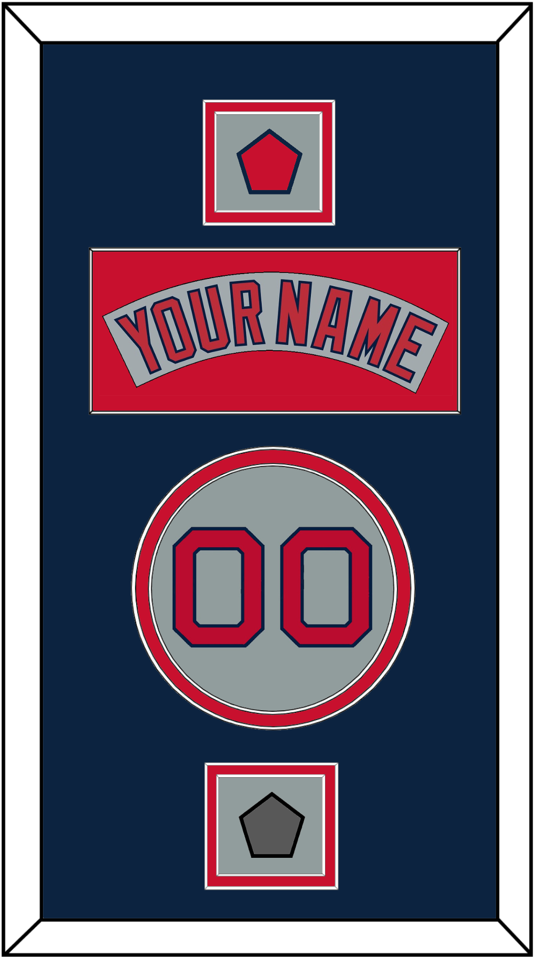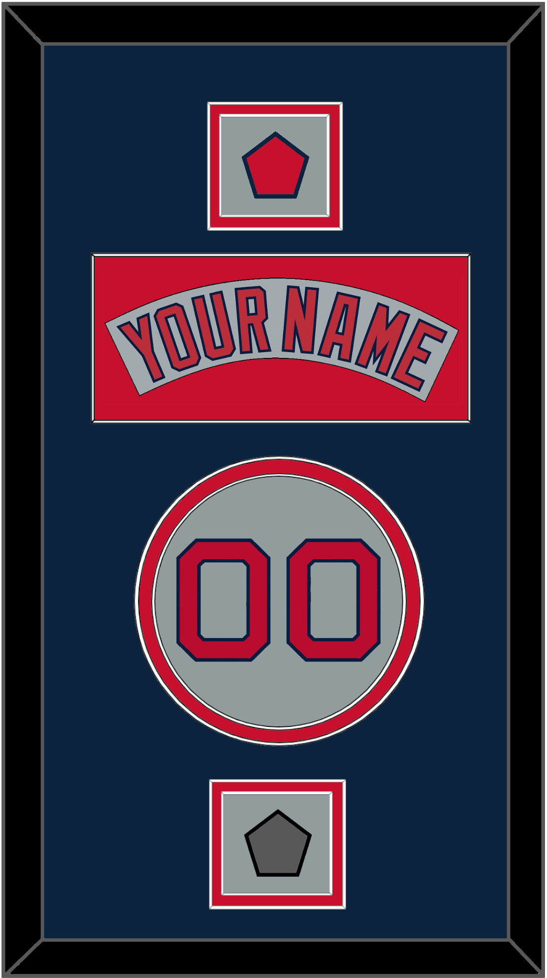 Boston Road Gray Jersey (1992 Through 2008) Nameplate, Number, Logo Sleeve Patch And World Series Champions Patch (2004, 2007, 2013 Or 2018).  Nameplate Is Single Mat Cut:  Blue Mat With Gray Nameplate Mounted On A Red Mat.  To Match The Jersey, Number And Patches Are Double Mat Cut:  Blue Mat Over A Red Mat, Red Number & Patches Mounted On A Gray Mat.  White Or Black Frame.