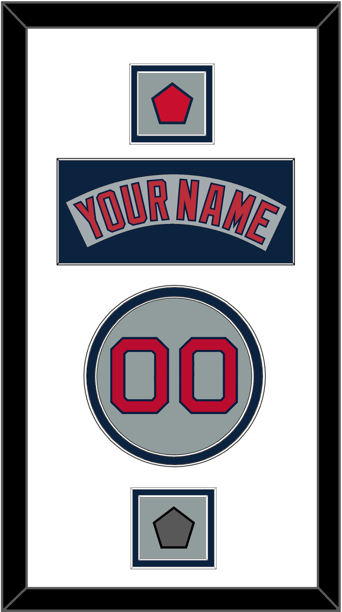 Boston Road Gray Jersey (1992 Through 2008) Nameplate, Number, Logo Sleeve Patch And World Series Champions Patch (2004, 2007, 2013 Or 2018).  Nameplate Is Single Mat Cut:  White Mat With Gray Nameplate Mounted On A Blue Mat.  To Match The Jersey, Number And Patches Are Double Mat Cut:  White Mat Over A Blue Mat, Red Number & Patches Mounted On A Gray Mat.  Black Frame.