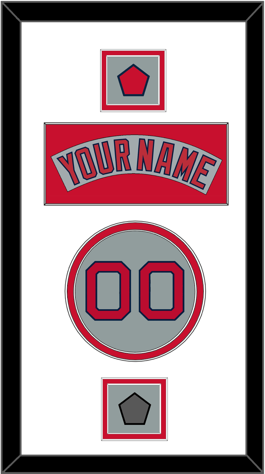 Boston Road Gray Jersey (1992 Through 2008) Nameplate, Number, Logo Sleeve Patch And World Series Champions Patch (2004, 2007, 2013 Or 2018). Nameplate Is Single Mat Cut: White Mat With Gray Nameplate Mounted On A Red Mat. To Match The Jersey, Number And Patches Are Double Mat Cut: White Mat Over A Red Mat, Red Number & Patches Mounted On A Gray Mat. Black Frame.