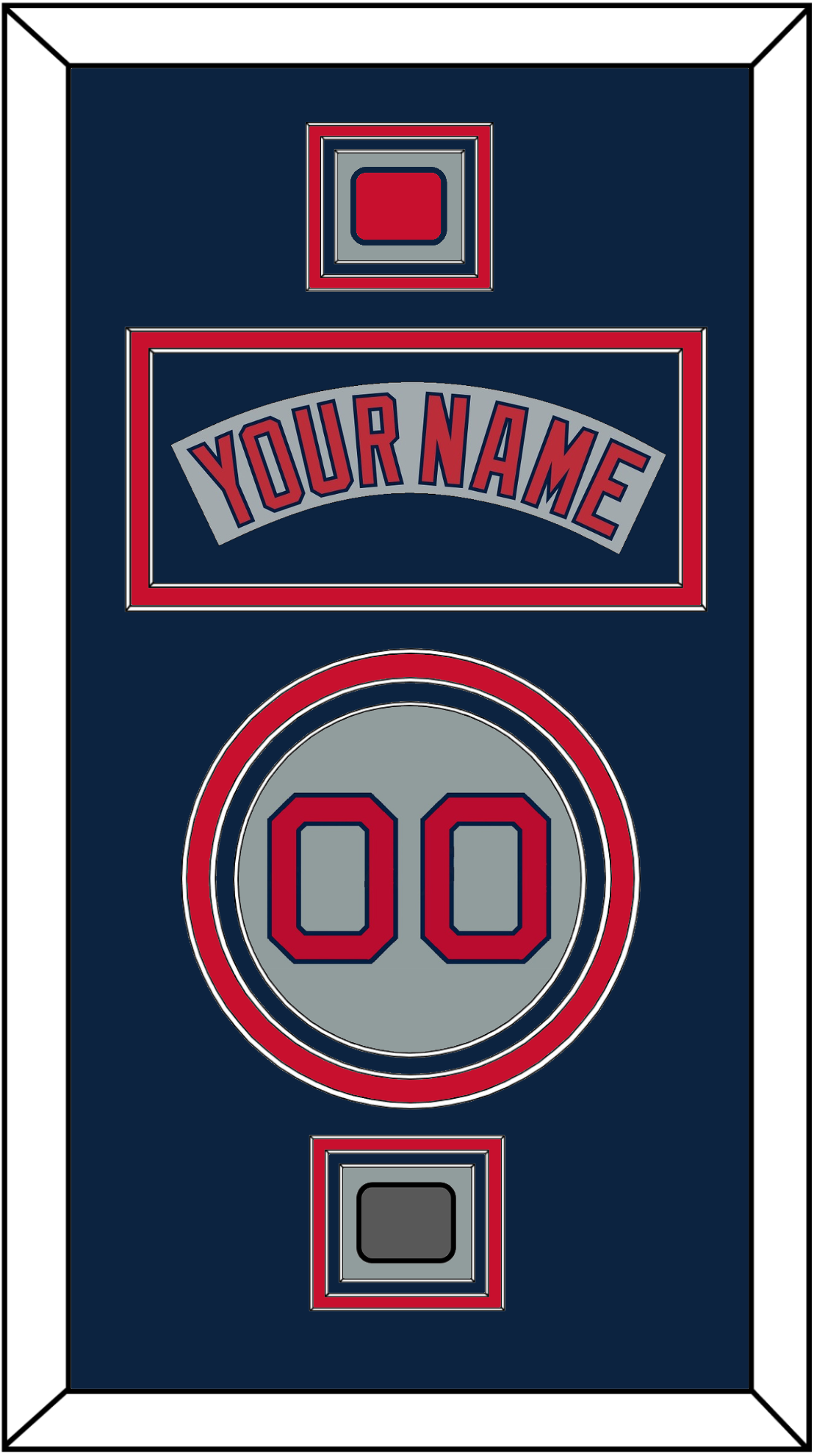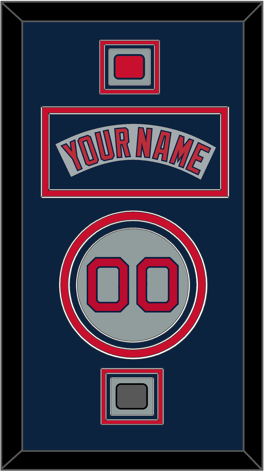 Boston Road Gray Jersey (1992 Through 2008) Nameplate, Number, Logo Sleeve Patch And World Series Champions Patch (2004, 2007, 2013 Or 2018). Nameplate Is Double Mat Cut: Blue Mat Over A Red Mat. Gray Nameplate Mounted On A Blue Mat. To Match The Jersey, Number And Patches Are Triple Mat Cut: Blue Mat Over A Red Mat Over A Blue Mat. Red Number & Patches Mounted On A Gray Mat. White Or Black Frame.