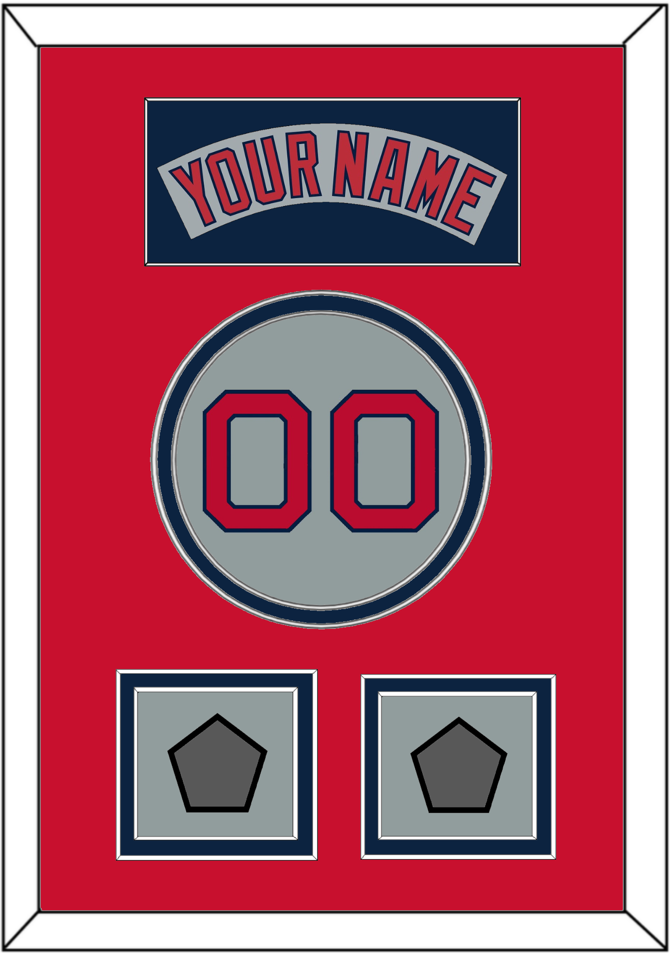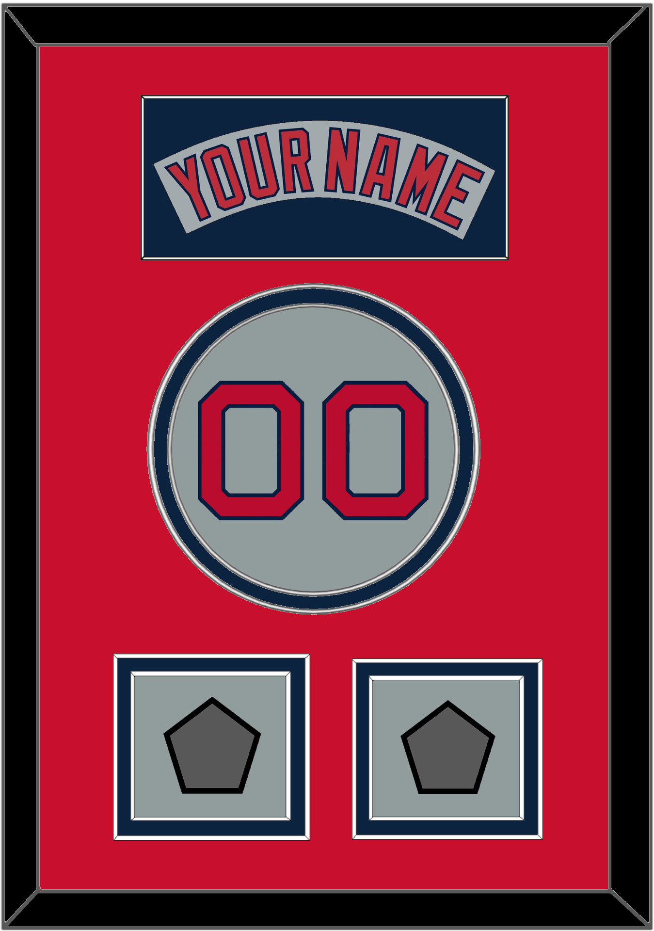 Boston Road Gray Jersey (1992 Through 2008) Nameplate & Number With Two World Series Jersey Patches (2004 & 2007, 2007 & 2013 Or 2013 & 2018).  Nameplate Is Single Mat Cut:  Red Mat With Gray Nameplate Mounted On A Blue Mat.  To Match The Jersey, Number And Patches Are Double Mat Cut:  Red Mat Over A Blue Mat, Red Number & World Series Patch Mounted On A Gray Mat.  White Or Black Frame.
