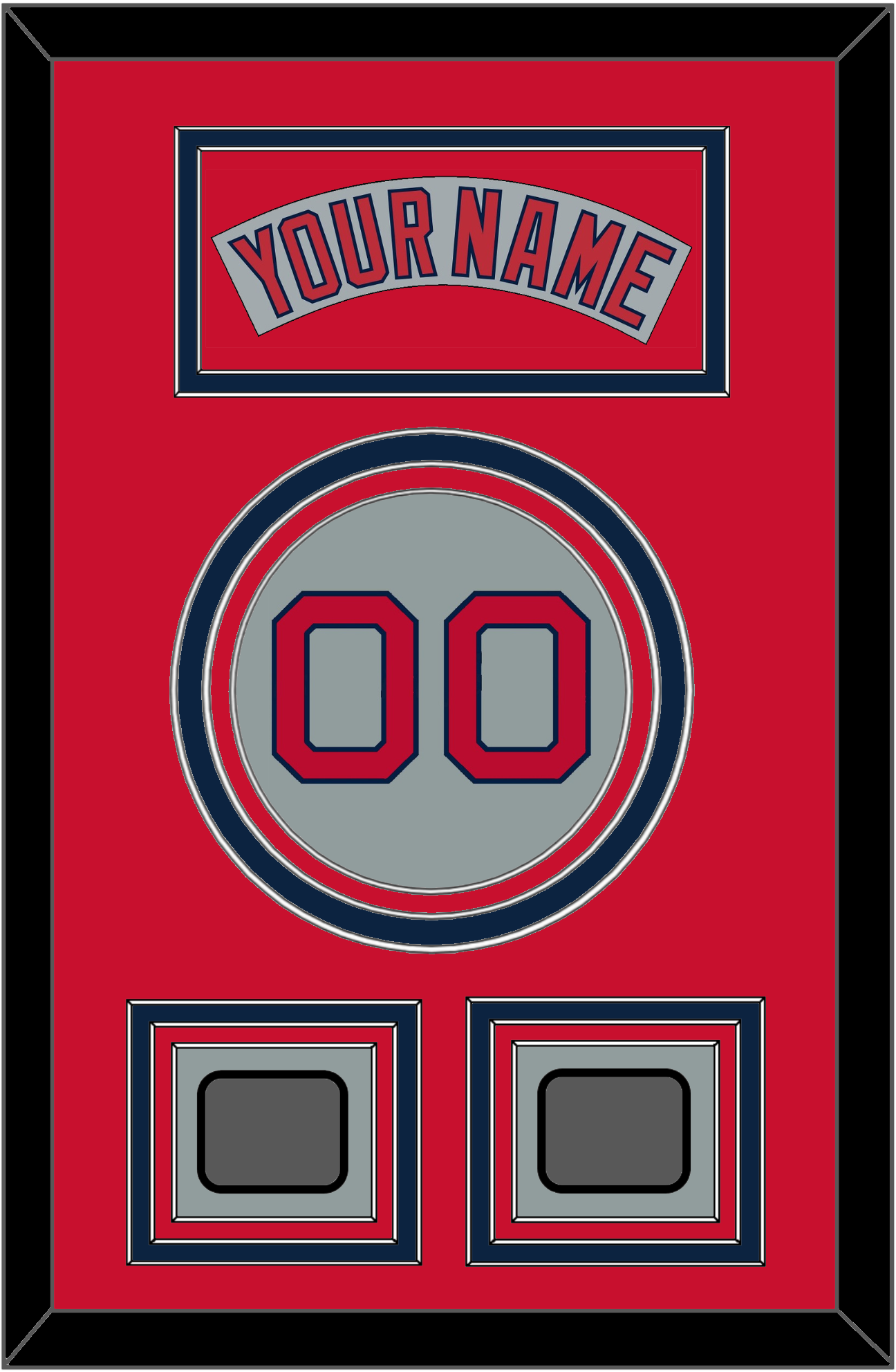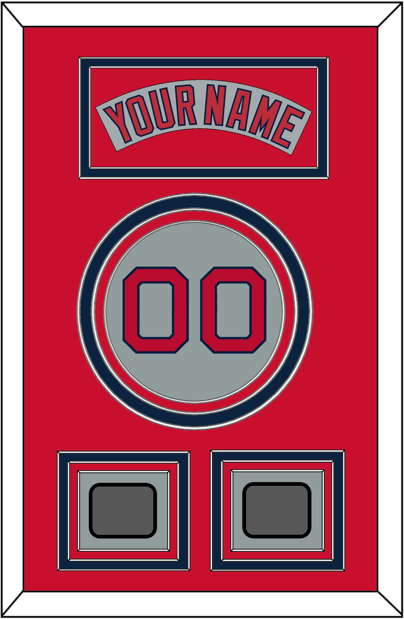 Boston Road Gray Jersey (1992 Through 2008) Nameplate & Number With Two World Series Jersey Patches (2004 & 2007, 2007 & 2013 Or 2013 & 2018). Nameplate Is Double Mat Cut: Red Mat Over A Blue Mat. Gray Nameplate Mounted On A Red Mat. To Match The Jersey, Number And Patches Are Triple Mat Cut: Red Mat Over A Blue Mat Over A Red Mat, Red Number & World Series Patch Mounted On A Gray Mat. White Or Black Frame.