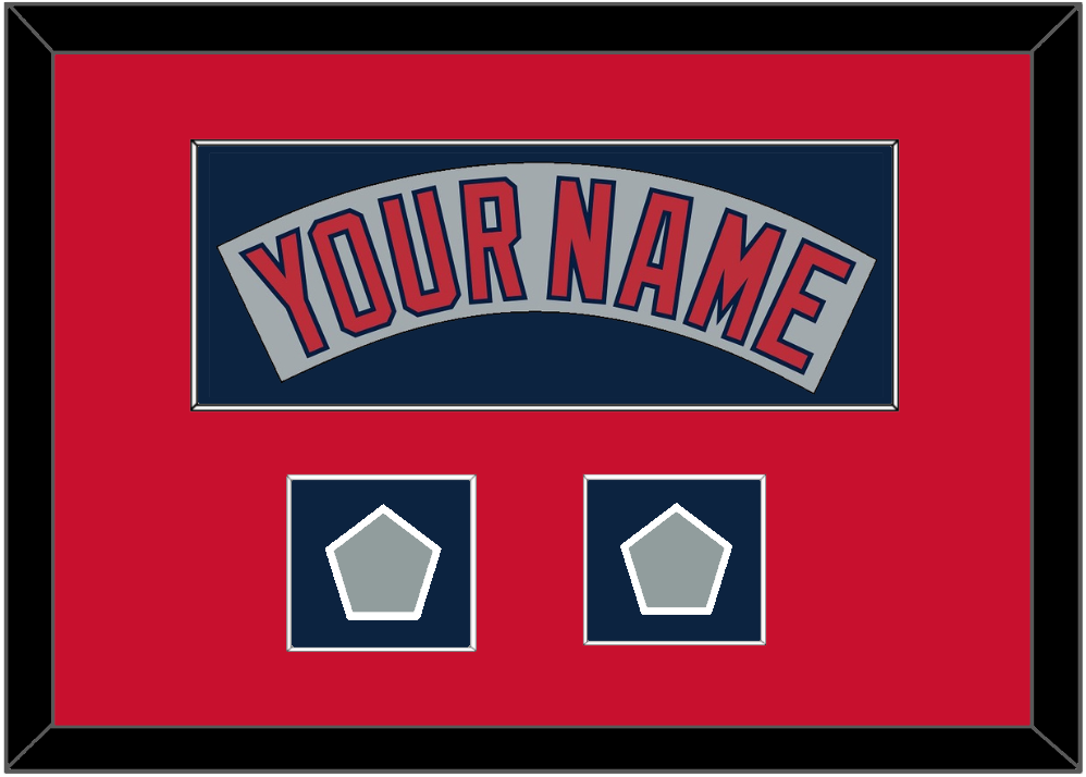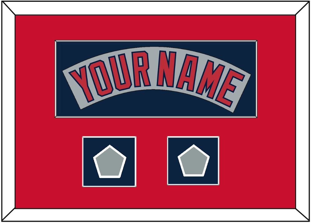 Boston Road Gray Jersey (1992 Through 2008) Nameplate With Two World Series Champions Patches (2004 & 2007, 2007 & 2013 Or 2013 & 2018). Single Mat Cut: Red Mat With Gray Nameplate & Patches Mounted On A Blue Mat. White Or Black Frame.