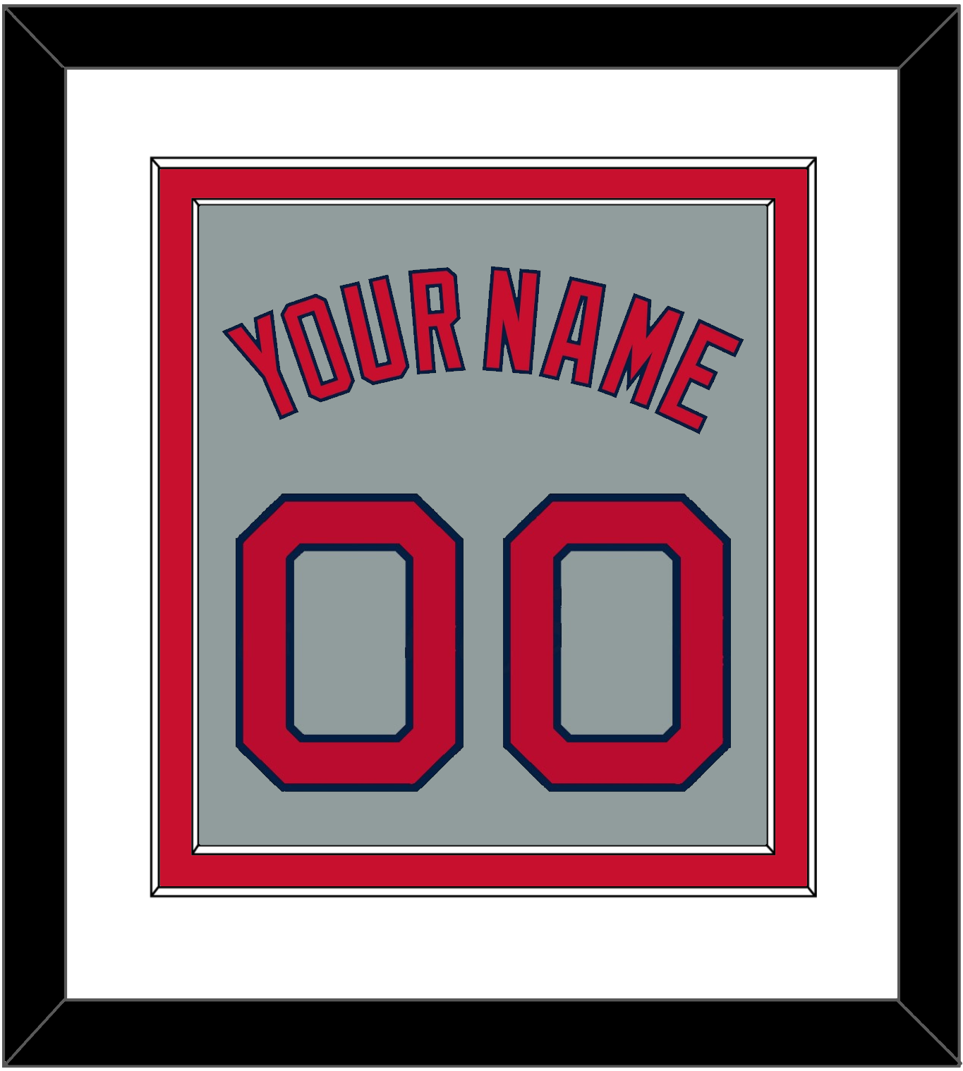 Boston Road Gray Jersey Name & Number.   White Mat Over A Red Mat.  Red Name And Number Mounted On A Gray Mat.  Black Frame.