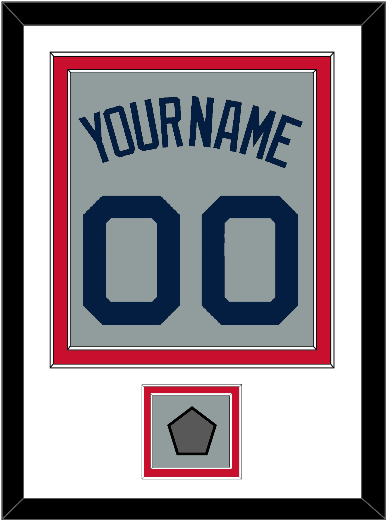 Boston Road Gray Jersey (2009 Through 2013) Name & Number With 2004, 2007, 2013 Or 2018 World Series Jersey Patch.  Double Mat Cut:  White Mat Over Red Mat.  Blue Name, Number & Patch Mounted On A Gray Mat.  Black Frame.