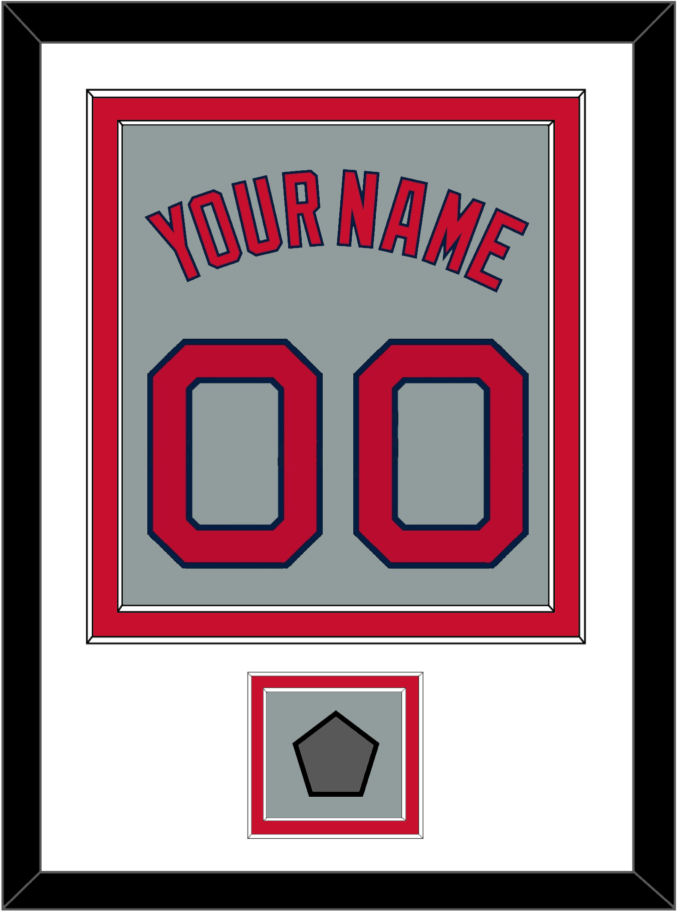 Boston Road Gray Jersey Name & Number With 2004, 2007, 2013 Or 2018 World Series Jersey Patch.  Double Mat Cut:  White Mat Over Red Mat.  Red Name, Number & Patch Mounted On A Gray Mat.  Black Frame.