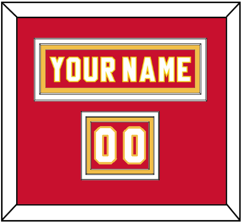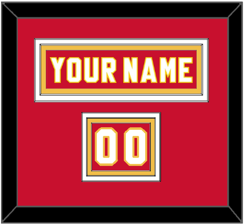 Calgary Home Red Jersey Nameplate & Numbers From Shoulder - The Nameplate Is Double Mat Cut: Red Mat Over A White Mat, Red Nameplate Mounted On Gold Mat. To Match The Jersey, The Numbers Are Triple Mat Cut: Red Mat Over A White Mat, Over Gold Mat. White Numbers Mounted On A Red Mat. Black Or White Frame.